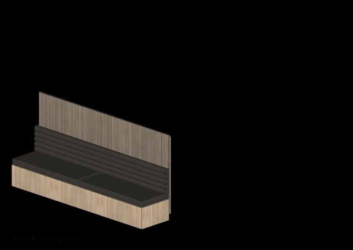 Banca existente con revestimiento de teverpan color Rovere , asiento de espuma 100% poliuretano tapizado con tela ALPHA NEGRO marca Multitop