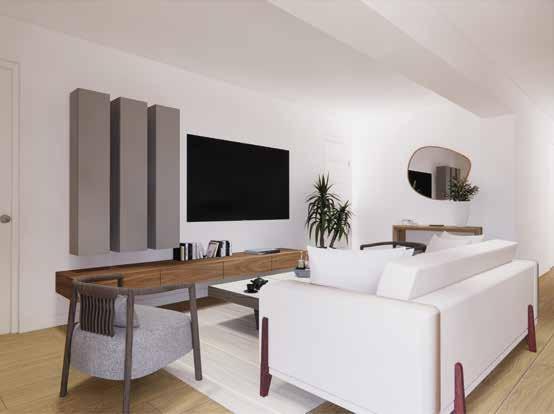MUEBLE TV: Mueble bajo estructurado en melamina de 18mm color Teka ártico marca ARAUCO con apertura de cajones push con correderas de cierre lento. poyo lateral estructurado en melamina 18mm RH color Roble rustico marca VESTO y pared enchapada en espejo importado con borde biselado pulido recto