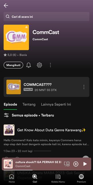 CommCast adalah wadah mahasiswa jurusan Ilmu Komunikasi di bawah naungan Himpunan Mahasiswa Ilmu Komunikasi Unsika yang berfokus pada bidang podcast baik secara audio maupun visual. CommCast berfokus memublikasikan konten-konten audionya melalui Spotify. Konten pertama yang saya edit berjudul “Mengenal Lebih Dalam SNPMB 2023” dan terus berlanjut hingga konten audio paling terakhir berjudul “Get to Know about Duta GenRe Karawang”. Saya menggunakan Adobe Audition untuk proses perekaman hingga pengeditan.