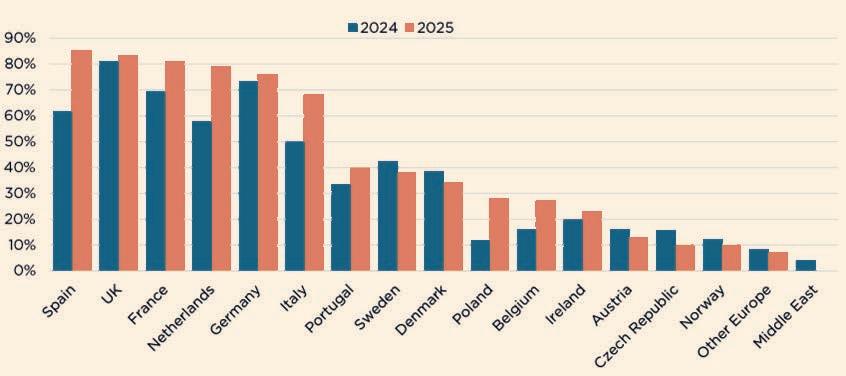 superior a 800.000 millones de euros. Detrás se sitúan Reino Unido y Francia. Más de la mitad de los inversores encuestados se plantea aumentar su asignación a activos inmobiliarios en Europa y Oriente Medio en 2025.