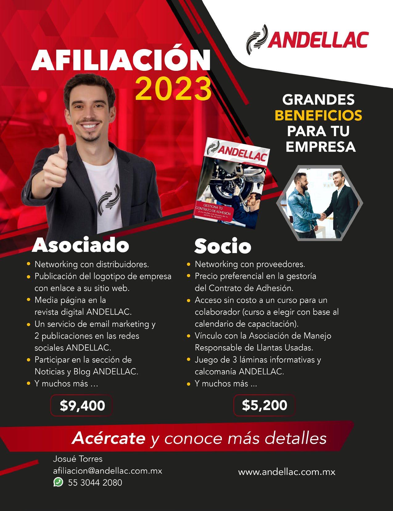 ANDELLAC es una publicación mensual de la Asociación Nacional de Distribuidores de Llantas y Plantas Renovadoras, A.C. Av. Insurgentes Sur No. 1524, Ofic. 303. Col. Crédito Constructor, Alcaldía Benito Juárez, C. P. 03940, Número de Reserva de Título de Derechos de Autor: 042006-071712491200-102 No. De Certificado de Licitud de Título: 3227 No. De Certificado de Licitud de Contenido: 2856. ANDELLAC investiga la seriedad de sus anunciantes, pero no se hace responsable por las ofertas realizadas por los mismos. El contenido de los artículos y notas periodísticas son responsabilidad de sus autores. Queda prohibidad la reproducción parcial o total por cualquier medio sin permiso por escrito del editor.
