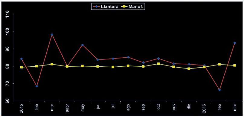 La capacidad utilizada de la industria llantera se mantuvo por arriba del 80.0% durante el último trimestre del 2015, asimismo, se caracterizó por ubicarse por arriba del promedio de la industria manufacturera. Este año inició con la misma tendencia, solamente en febrero sufrió un descenso