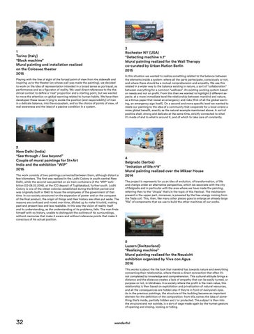2 New Delhi (India) "See through / See beyond” Couple of mural paintings for St+Art India and the exhibition “WIP” 2016 The work consists of two paintings connected between them, although distant a few kilometers. The first was realized in the Lodhi Colony in south-central New Delhi, while the second was painted on six train containers of the "WIP" exhibition (02-28.02.2016), at the ICD deposit of Tughlakabad, further south. Lodhi Colony is one of the oldest colonies established during the British period and was originally built in 1940 to house the employees of the government of that time. In our society structured on the expansion of power and on the conquest of the final product, the origin of things and their history are often put aside. The reasons are confused and mixed over time, diluted up to make it turbid, making past and present less and less readable. In this way the vision of reality itself and its understanding, as the understanding of its problems, fails. The man finds himself with no history, unable to distinguish the outlines of his surroundings, without memories that make it aware and without reference points that make it conscious of his actual position.