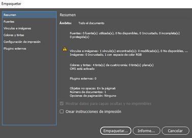 El documento se puede guardar en la ventana de archivo, como en un software regular. Pero también se puede empaquetar, esto nos da la posibilidad de vicular imágenes, ajustar valores, para esto nos vamos a la ventana de empaquetar y seleccionamos empaquetar y seleccionamos las opciones que sean necesarias.