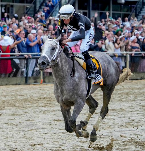 ABOVE: D. Wayne Lukas ponies Seize the Grey before the 2024 Preakness. RIGHT: Seize the Grey and Jaime Torres winning the 2024 Preakness Stakes.