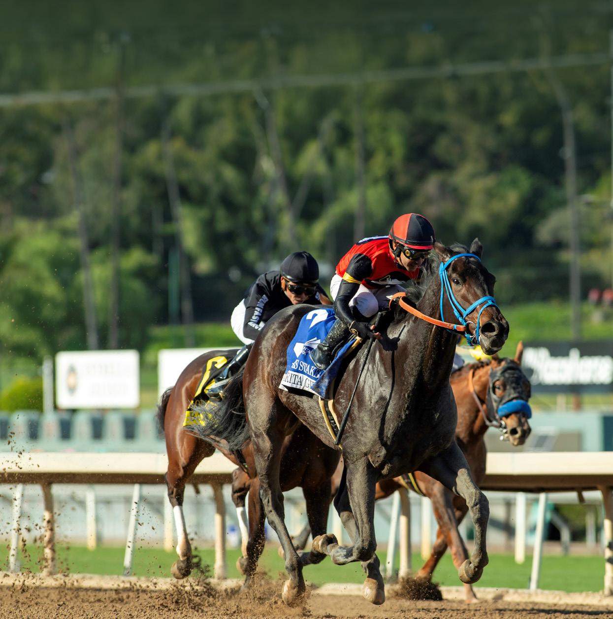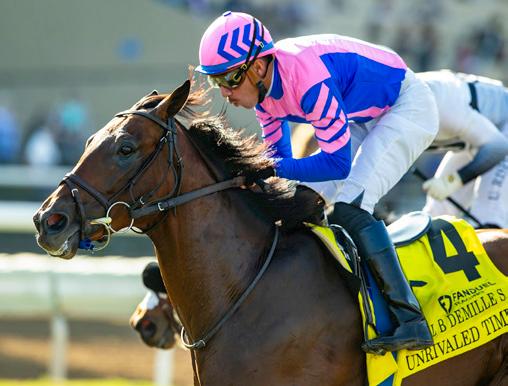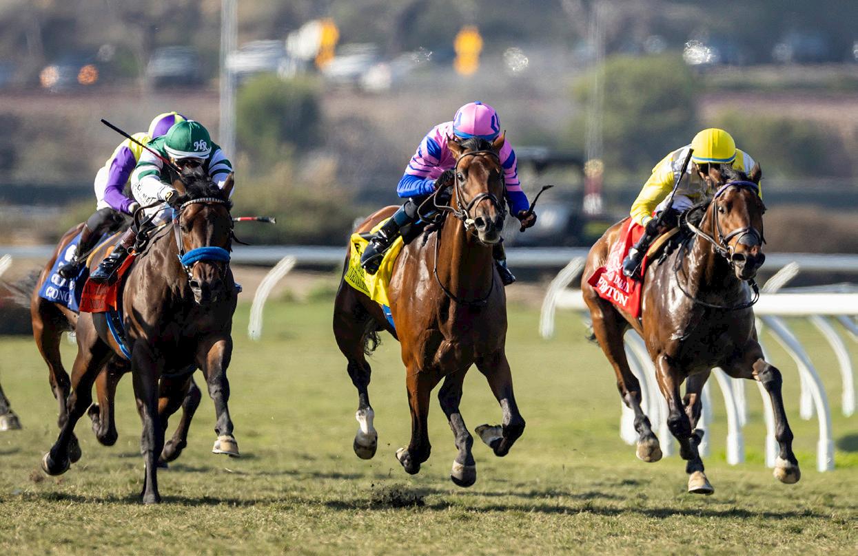 LEFT & RIGHT: Unrivaled Time, with Diego Herrera up, wins the 2025 Cecil B. DeMille Stakes at Del Mar for trainer Leonard Powell and Innergy Racing Corp.