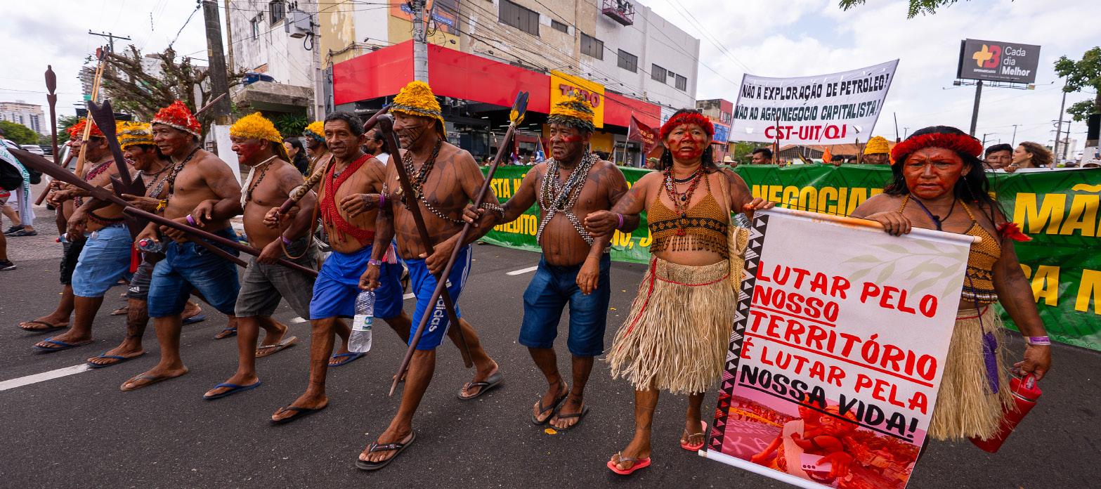 Docentes do ANDES-SN caminharam ao lado de indígenas, quilombolas, ribeirinhos, camponeses e manifestantes de todo o mundo, em um protesto que uniu as diversas lutas em defesa dos territórios, da vida e por justiça climática. As e os manifestantes cobravam também