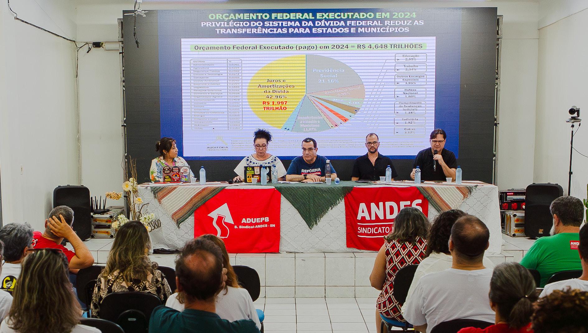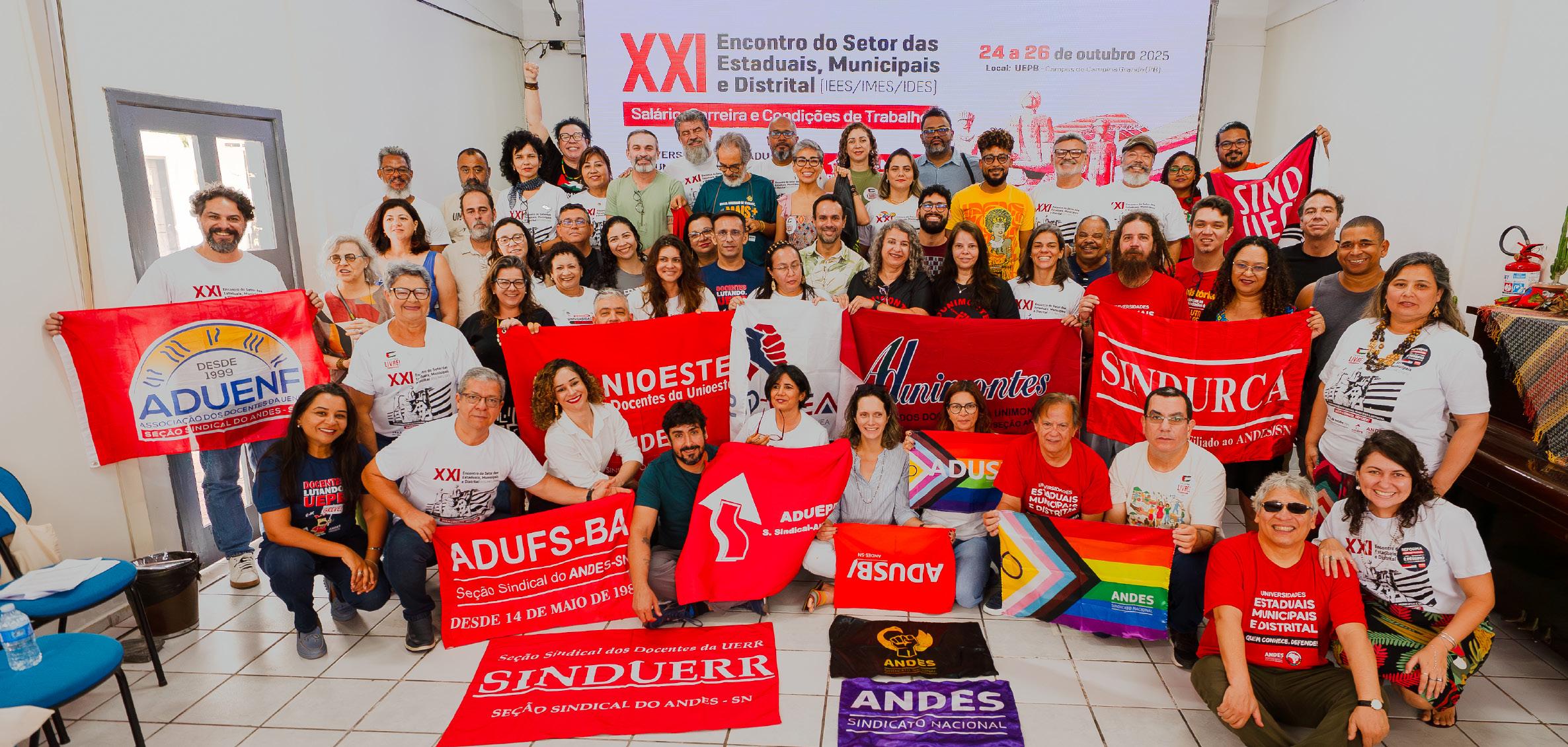 OXXI Encontro do Setor das Instituições Estaduais, Municipais e Distrital de Ensino Superior (Iees, Imes e Ides) do ANDES-SN, realizado em Campina Grande (PB), entre os dias 24 e 26 de outubro, contou com cerca de 70 docentes, de 19 Seções Sindicais, e destacou urgências da carreira docente, políticas de combate à violência e adoecimento no trabalho. A Associação dos Docentes da Universidade Estadual da Paraíba (Aduepb SSind.) foi a anfitriã do evento, em meio à greve iniciada em 22 de setembro na Universidade Estadual da Paraíba (UEPB), marcada por uma séria crise financeira e precarização. A abertura contou com representantes da diretoria do ANDES-SN, da Aduepb SSind, da Associação dos Docentes da Universidade Federal de Campina Grande (ADUFCG SSind.), do movimento estudantil, da Reitoria da UEPB e do Sindicato dos Trabalhadores e Trabalhadoras em Educação do Estado da Paraíba (Sintep-PB).
