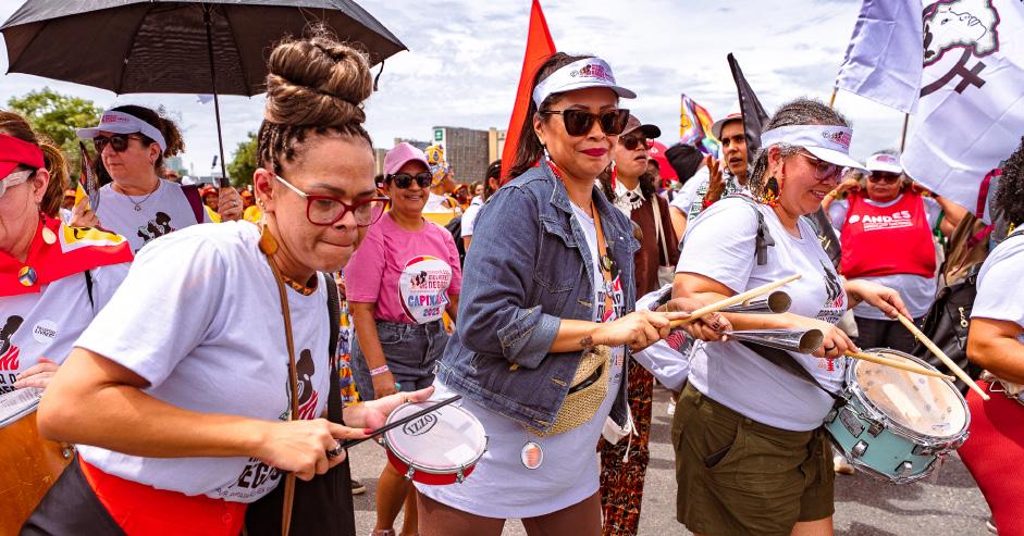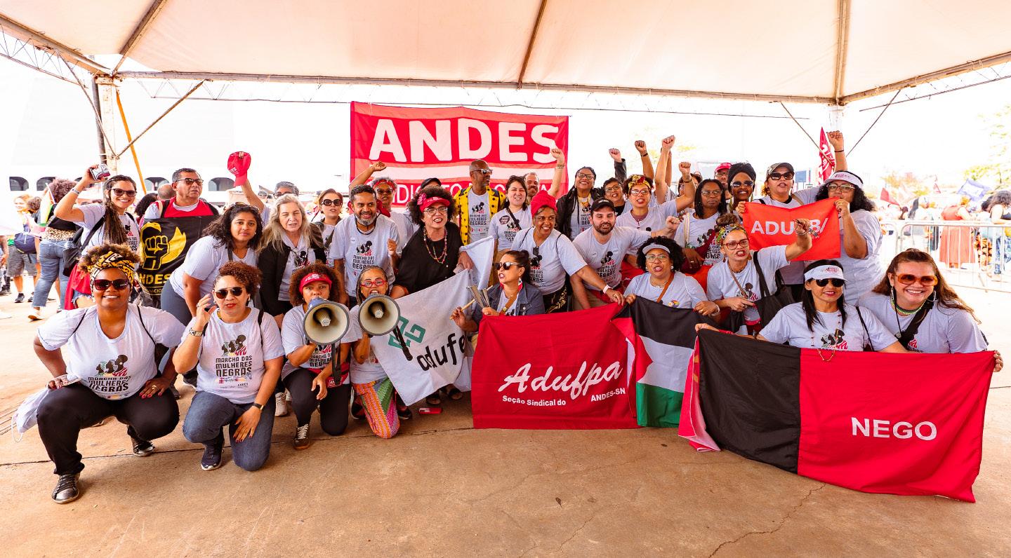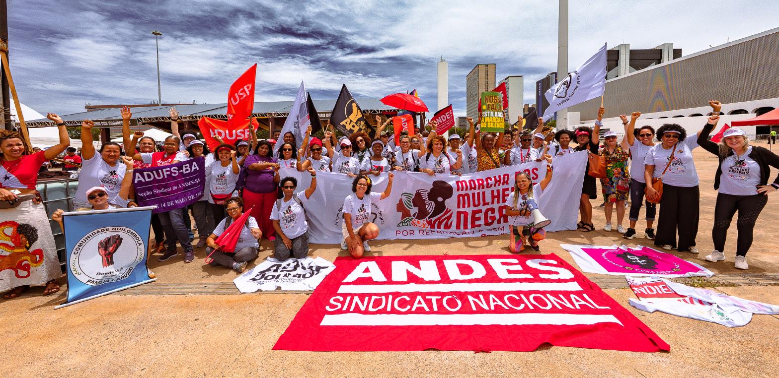 Em uma das manifestações mais expressivas da década, cerca de 300 mil mulheres negras do Brasil e de outros 40 países ocuparam a Esplanada dos Ministérios, em Brasília (DF), no dia 25 de novembro, durante a 2ª Marcha das Mulheres Negras, que trouxe como tema “Por Reparação e Bem Viver”. Organizada pelo Comitê Nacional da Marcha das Mulheres Negras, a mobilização colocou em pauta direitos fundamentais como moradia, emprego, segurança, vida livre de violência e políticas de reparação para a população negra. A participação do ANDES-SN foi deliberada no 67º Conad, realizado em Belo Horizonte (MG). Desde então, a diretoria do Sindicato Nacional, por meio do Grupo de Trabalho de Políticas de Classe para as Questões Étnico-Raciais, de Gênero e Diversidade Sexual (GTPCEGDS), atuou de forma ativa nos encaminhamentos e na construção do processo organizativo, em diálogo com o Fórum Nacional de Mulheres Negras e com o Comitê Impulsionador da Marcha. Como parte da preparação, o Sindicato Nacional disponibilizou cerca de 20 ônibus, vindos de diversas regiões do país, garantindo a presença de mulheres negras na capital federal.