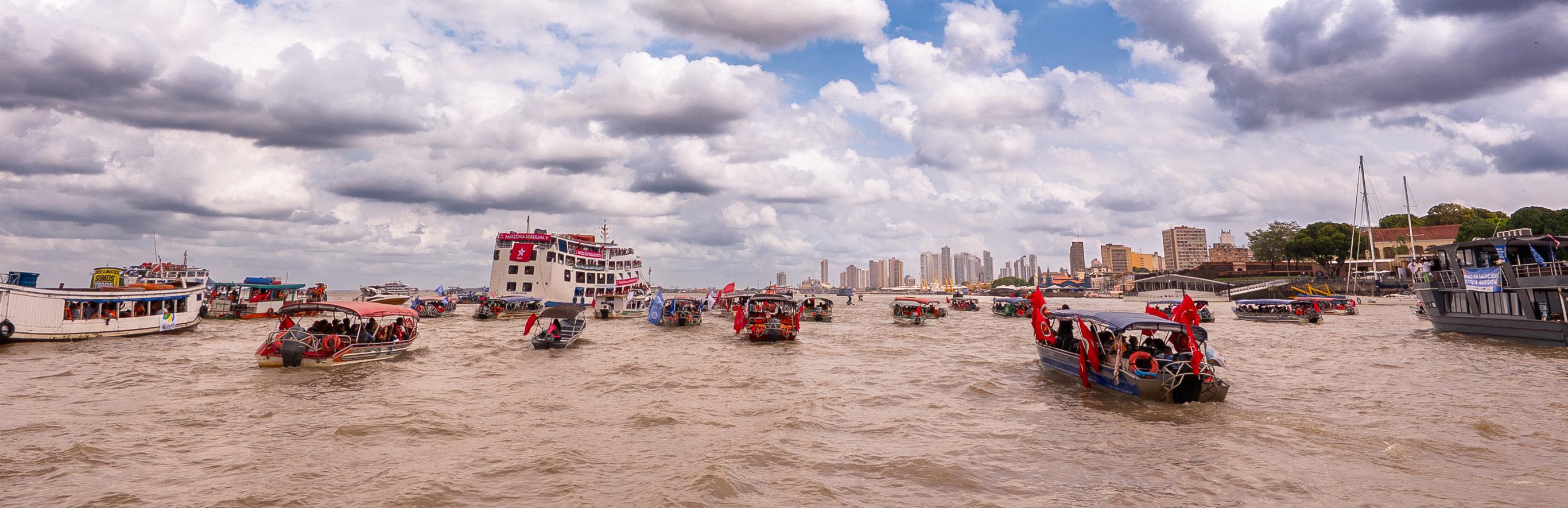 Faixas e cartazes ornamentavam os barcos de grande e pequeno porte, durante o percurso de 7 milhas náuticas, denunciando as contradições da COP 30 e expondo as pautas dos povos, movimentos e entidades. A manifestação teve início na Universidade Federal do Pará (UFPA), território da Cúpula dos Povos, e seguiu margeando o rio Guamá - que depois vira rio Guajará - até a Vila da Barca, área de