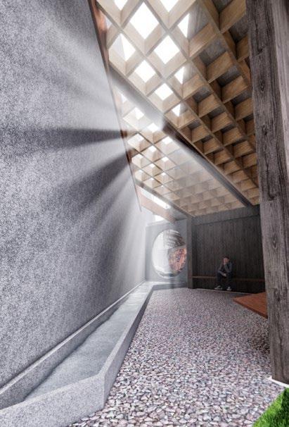 There is a path that visually connects pedestrians directly into the facility. At the front there is a statue of a standing man (a timeless signage element) facing the main access. Under the large sloping roof, there are both indoor and outdoor areas. When the user enters the building, there is an increased spatial height inside. It is surrounded by a porous façade that allows visitors to see all the way to the back of the site. Information can be displayed on the wall.