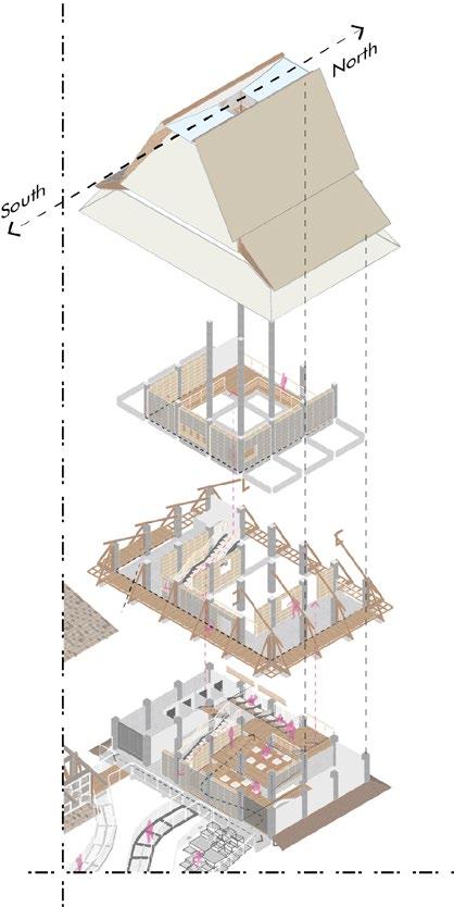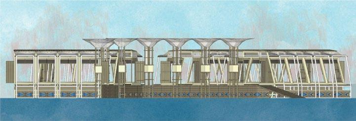 Tail zone at the back, facing the land or floating village which act as operational space which accomodates open kitchen, fisheries storage, toilet area, wooden workshop, and logistic dock.