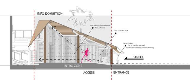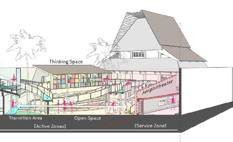 To create an immersive experience, spaces are designed to evoke awe in order to create long-lasting memories. The space is designed to stimulate adaptive behavior since the visitors are given “multiple choices” of how they interact with the space based on the situation. The space is also designed to evoke certain behavior (conscious or unconscious). The space incorporates natural elements due to its healing properties and maintains ecological balance. This site is located in the center of the city of Jogjakarta which is limited, prime, and contains cultural values. To make more space on a limited site, I try to overlap the spaces and slice the plan diagonally. There’s a visual axis from south to north. Since the government revitalized the sidewalk area and the site’s located close right between a big shopping mall and book store, the parking area’s still provided but’s limited for public visitors with big-size private transportation (only for logistics and other important needs such as event, guest, and etc.