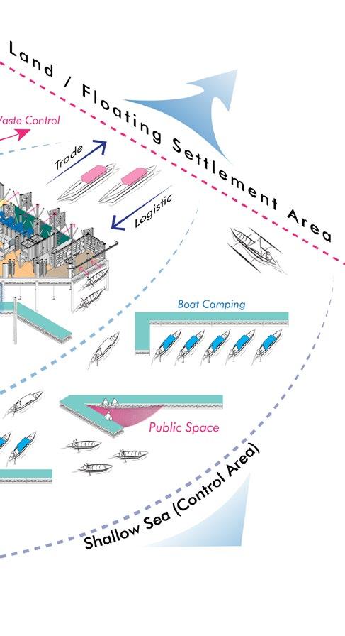 A structure (order) from fish bone diagram to act as center of activity for Bajau Community. Floating structure with anchor and pillar to adjust dynamic sea level. Wooden structure (same material as local stilt houses) to involve local craftmanship Ordering principle of Bajau (respect the law of nature).