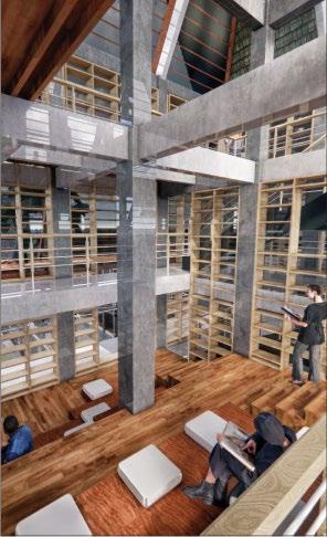 Immersive reading experience by playing with scale and book shelves as wall element that envelope the space like a maze which can be accessed from each floor.