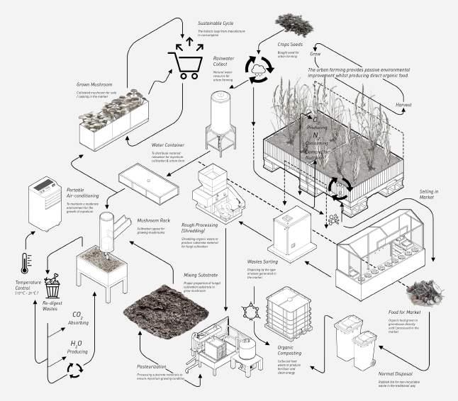 In this project, the recycling and production system of the surplus food consumed by the Great Yarmouth Market is brought back to the site ontology, reconnecting the market structure and the recycled food production chain through a structured architectural language. The concept of continuous production aimed at extending the metabolic structure, starting with waste and ending with built form. It gives new value to those otherwise useless, discarded everyday objects - namely "metabolic architecture", which is a dystopian "Food Parliament" space proposal.