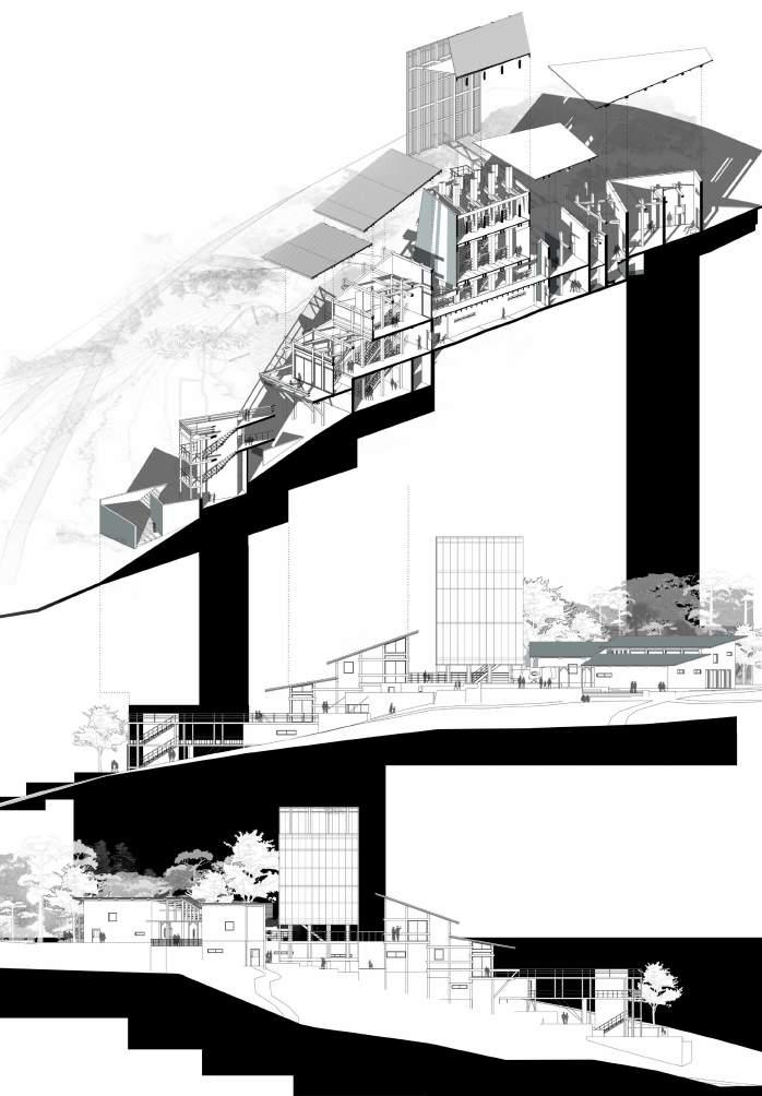The monument defines a boundary condition as an anchor to regulate the surrounding site. Throughout the changing history of the urban landscape, in both time and space, scenes are experienced as moving perspectives, which distribute the viewing frame into spaces. Therefore, the city acts as a leitmotiv, relating to a past, and the building becomes a place to record and to celebrate these views and memories of the city. The building itself separates into experiences of ground and separation (plinth and tower) and organizes a journey up the hillside that concludes in views of both the monument and the urban horizon. The spaces are explored systematically via elements that are repeated, rotated, shifted and eventually settle in a new position. The significance lies in the image of all the compositions and moments, forming a collective archival architecture.