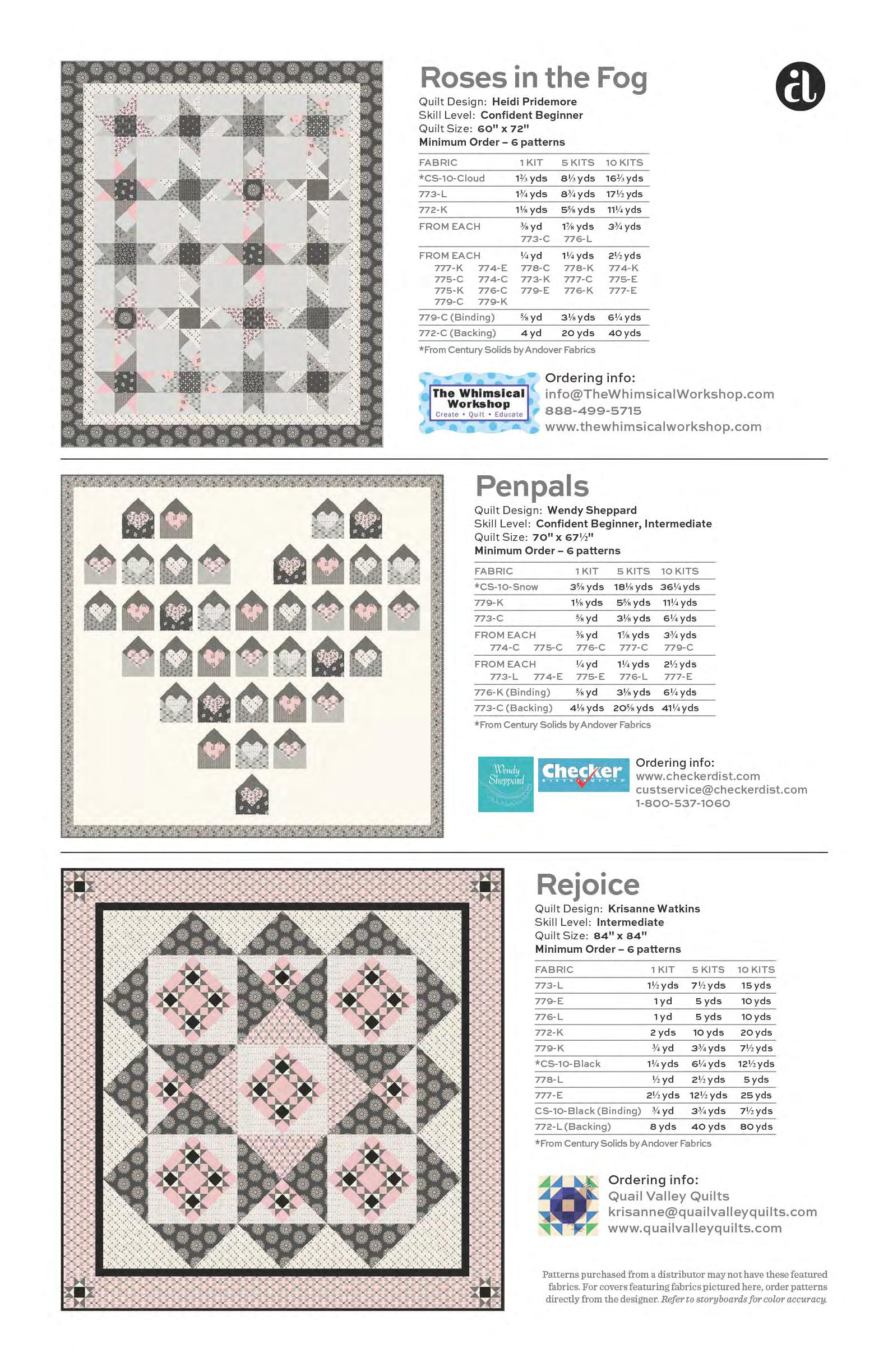 Patterns purchased from a distributor may not have these featured fabrics. For covers featuring fabrics pictured here, order patterns directly from the designer. Refer to storyboards for color accuracy.