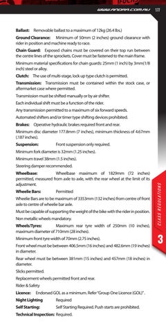 Ballast: Removable ballast to a maximum of 12kg (26.4 lbs.) Ground Clearance: Minimum of 50mm (2 inches) ground clearance with rider in position and machine ready to race. Chain Guard: Exposed chains must be covered on their top run between the centre lines of the sprockets. Cover must be fastened to the main frame. Minimum material specifications for chain guards: 25mm (1 inch) by 3mm(1/8 inch) steel or alloy. Clutch: The use of multi-stage, lock up type clutch is permitted. Transmission: Transmission must be contained within the stock case, or aftermarket case where permitted. Transmission must be shifted manually or by air shifter. Each individual shift must be a function of the rider. Any transmission permitted to a maximum of six forward speeds. Automated shifters and/or timer type shifting devices prohibited. Brakes: Operative hydraulic brakes required front and rear. Minimum disc diameter 177.8mm (7 inches), minimum thickness of 4.67mm (.187 inches). Suspension: