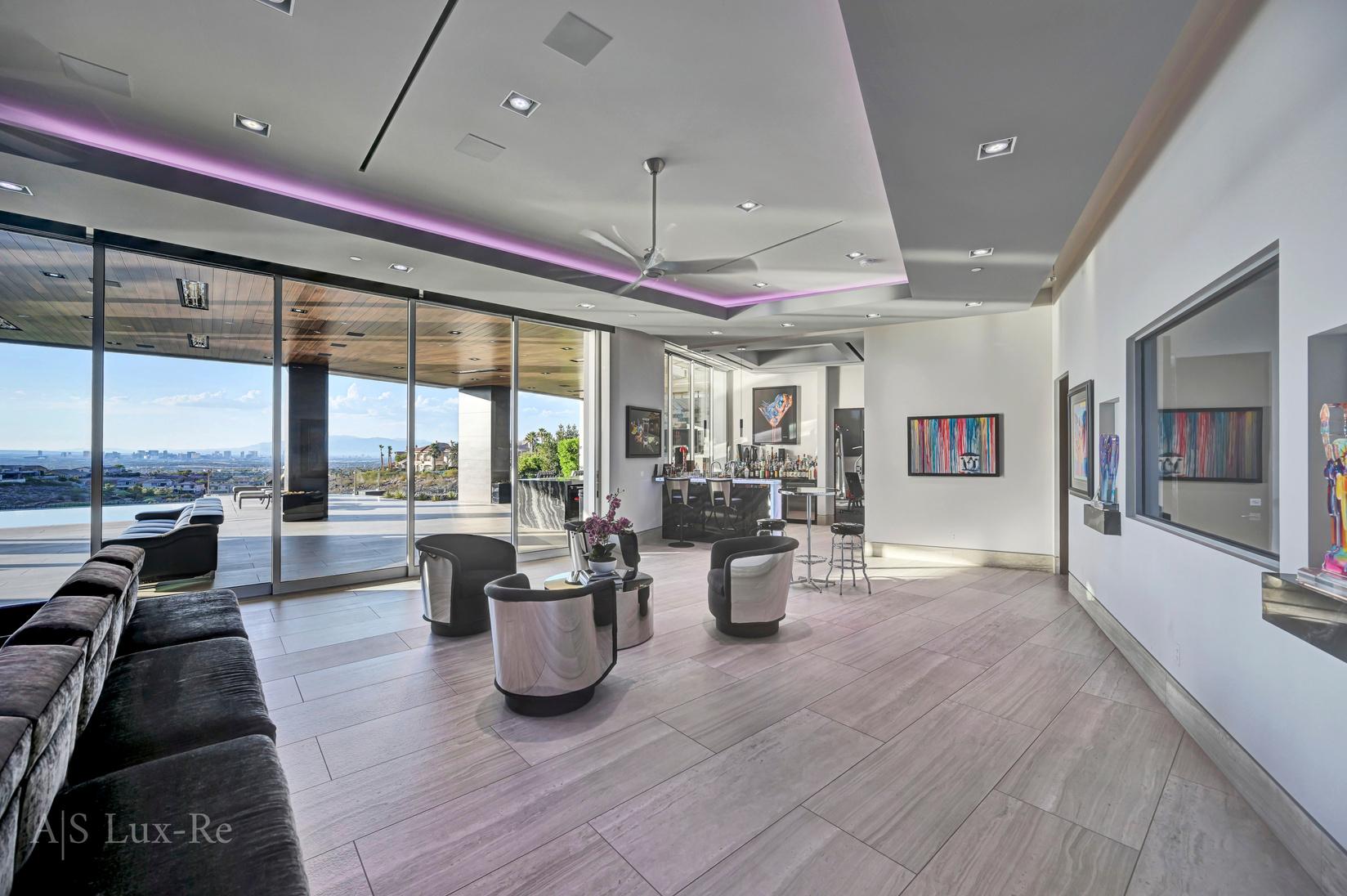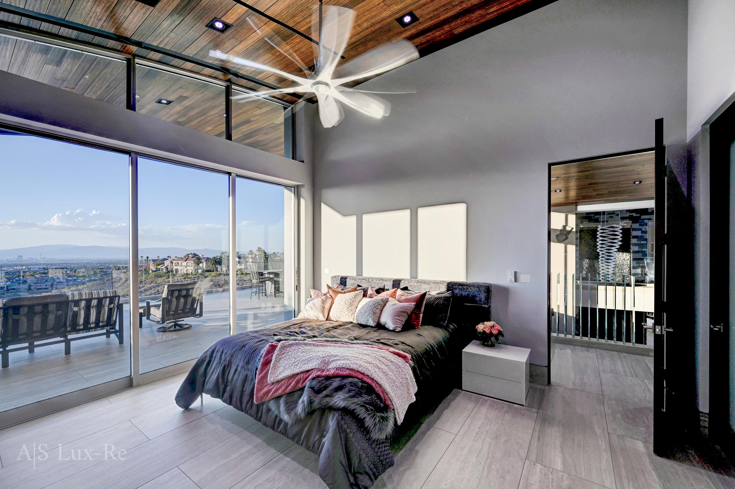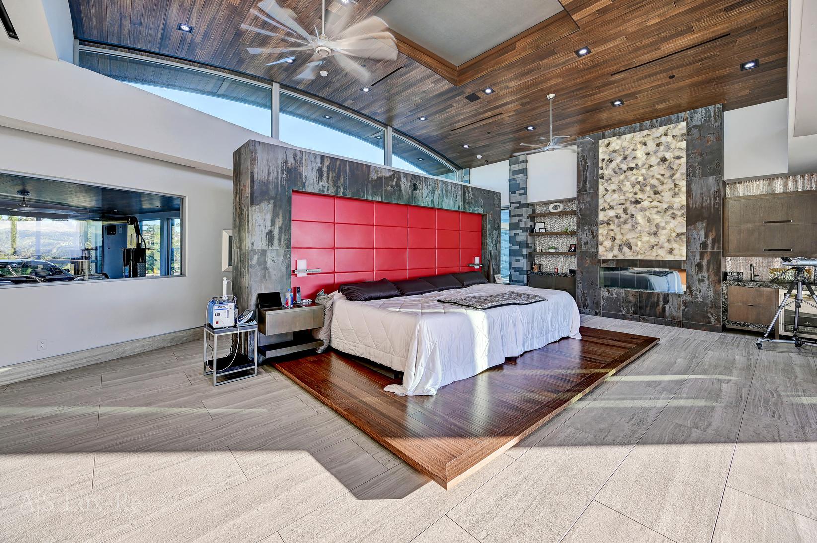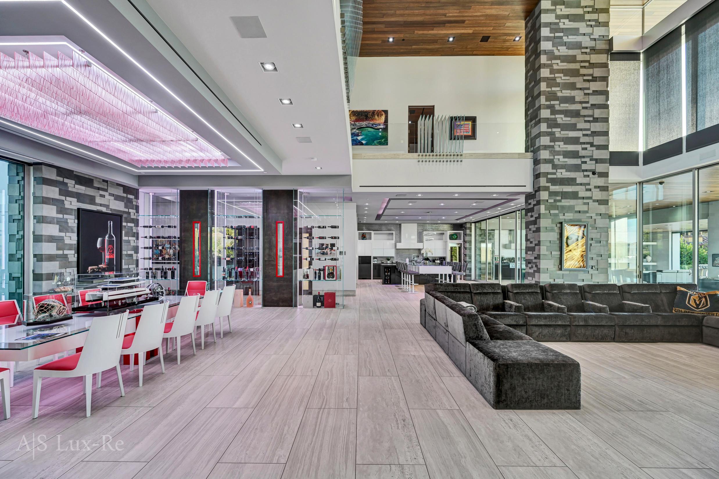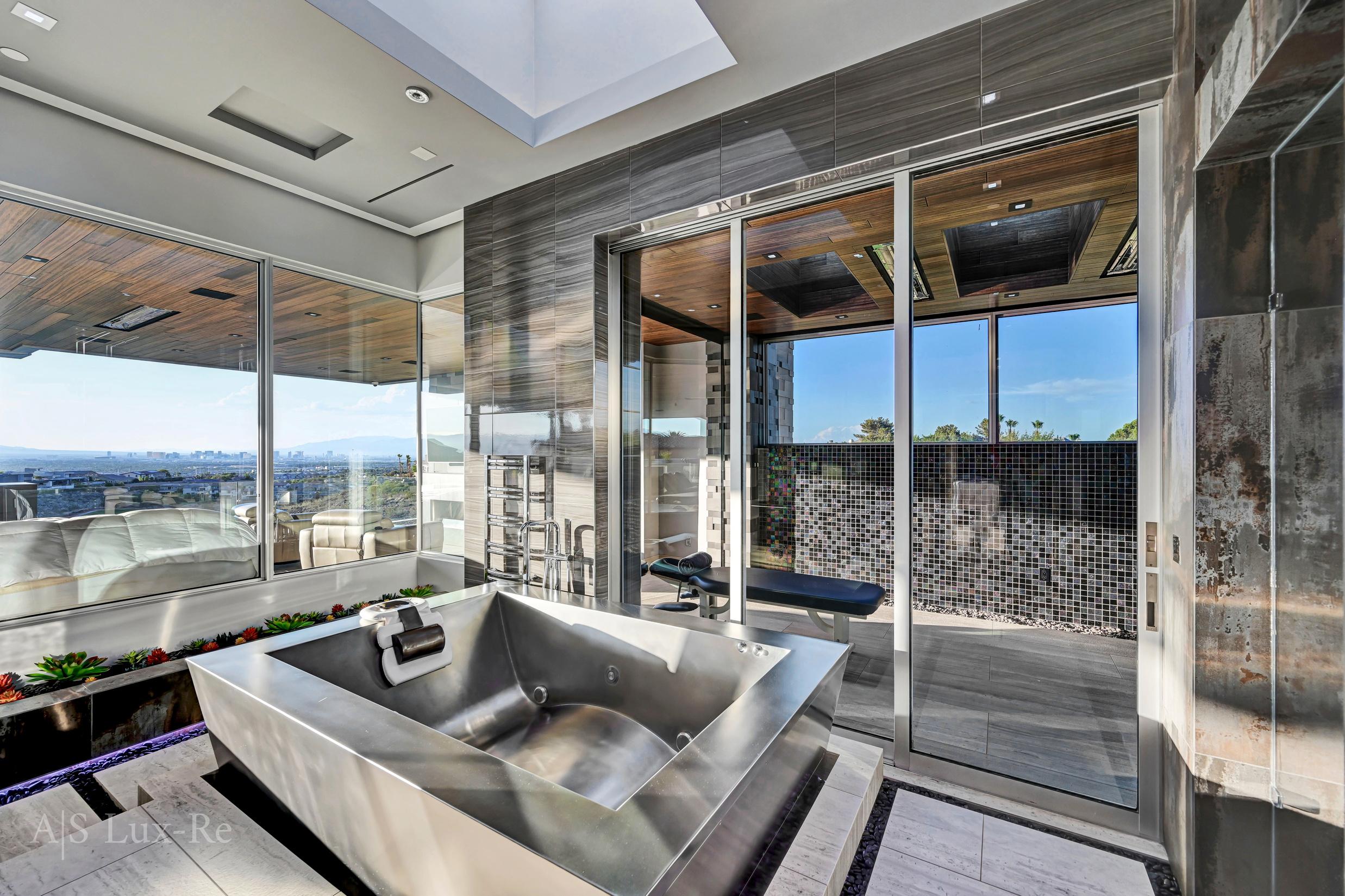 Primary suite has a vast skylight, strip & Golf Course Views, as well as large dual sided projector screen
