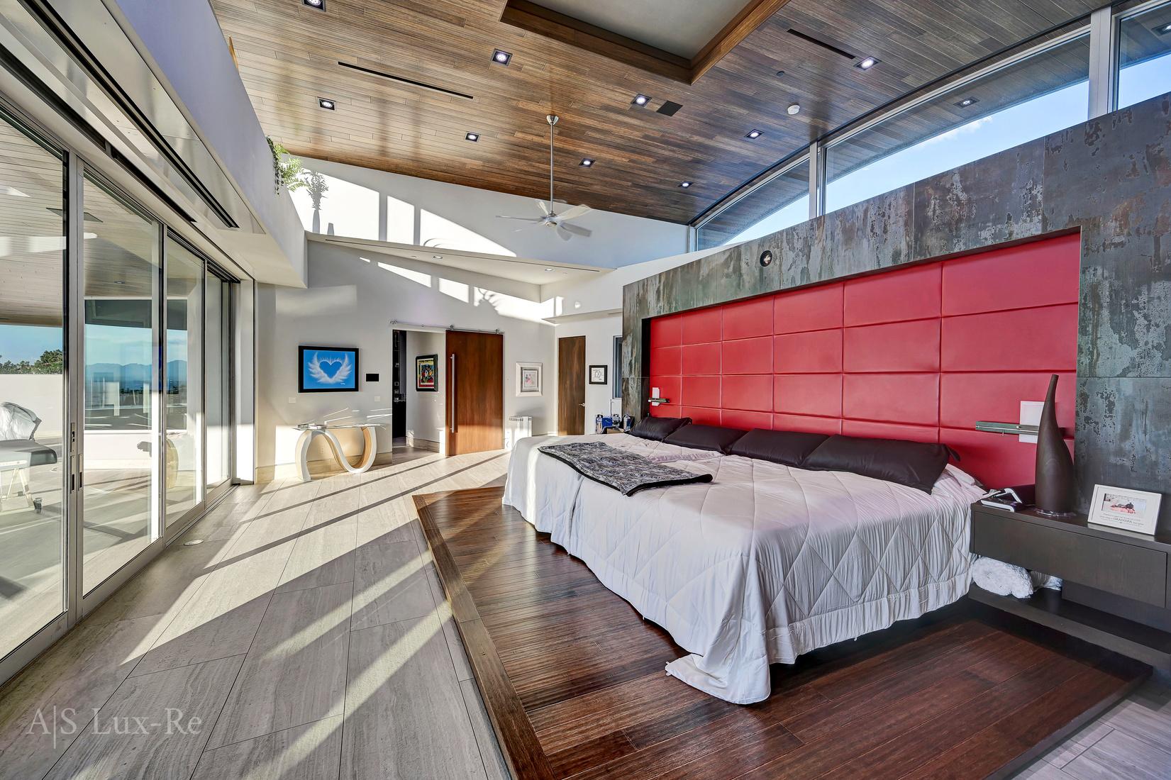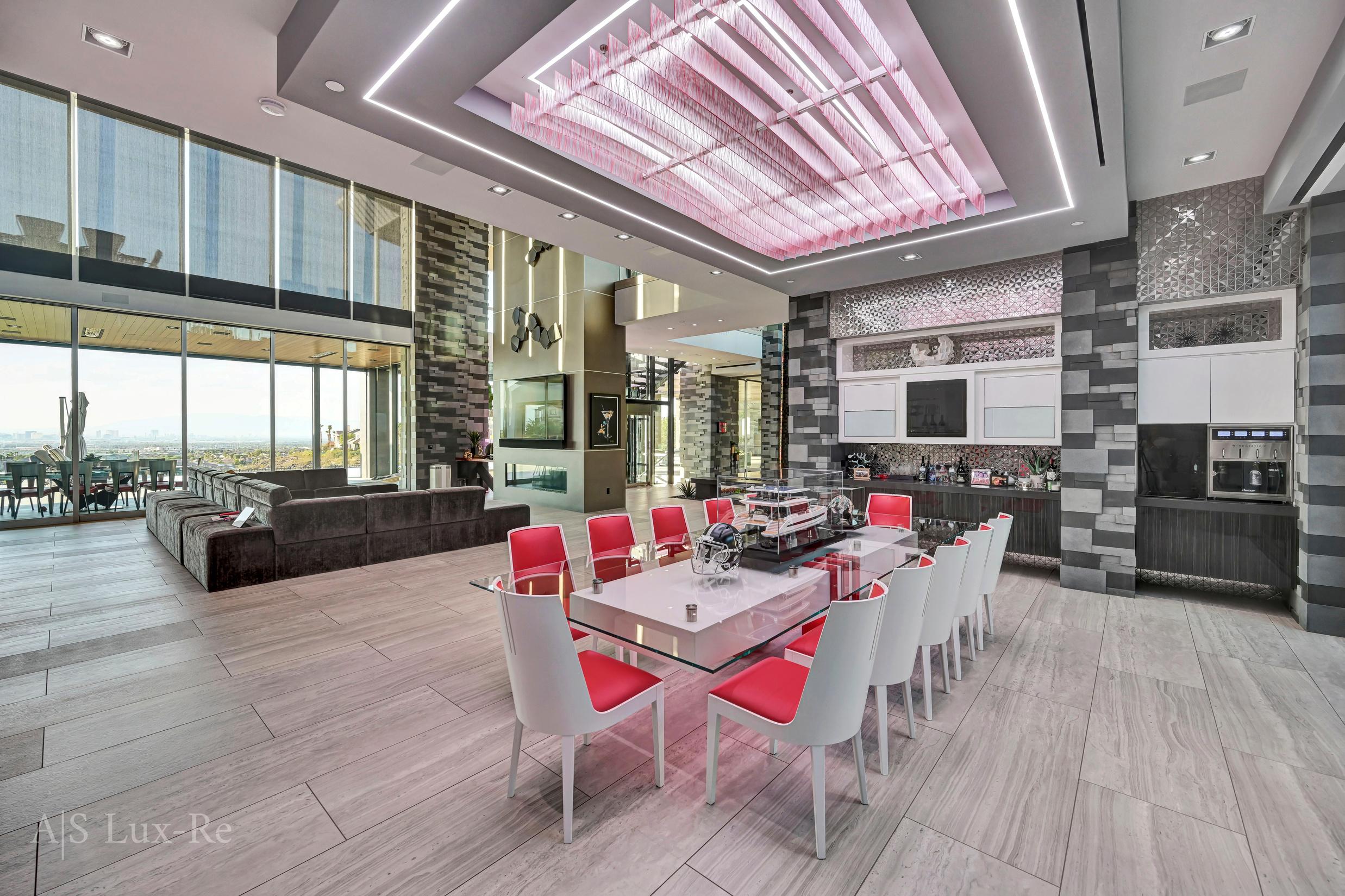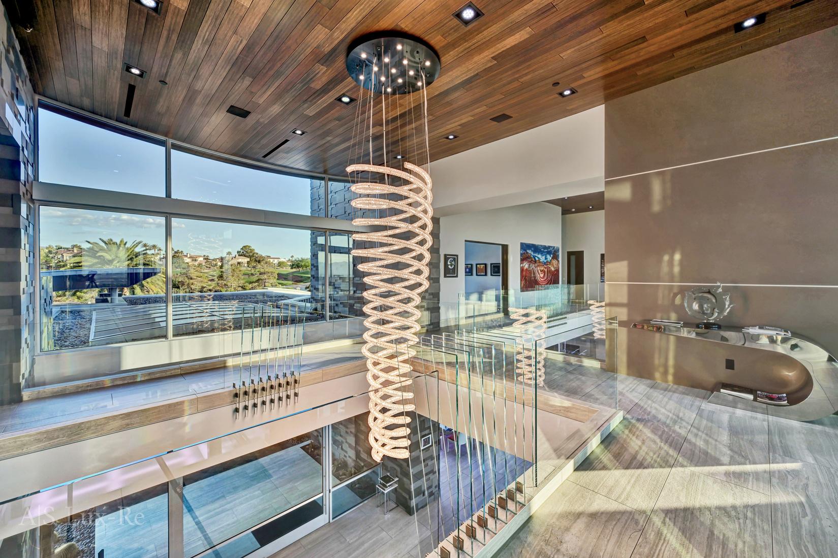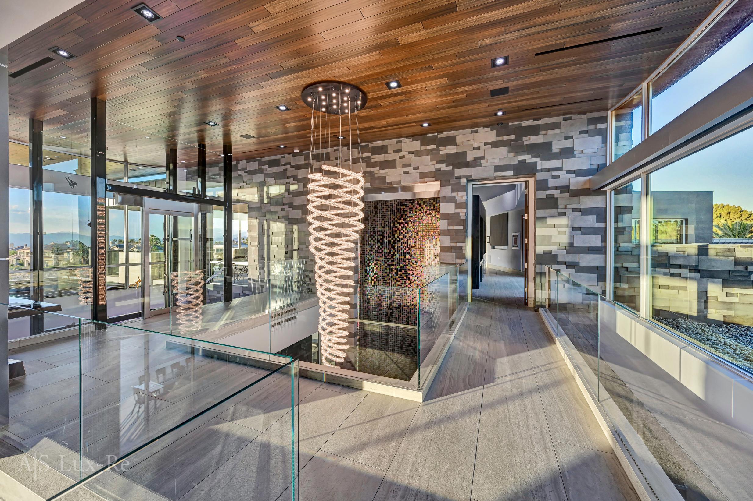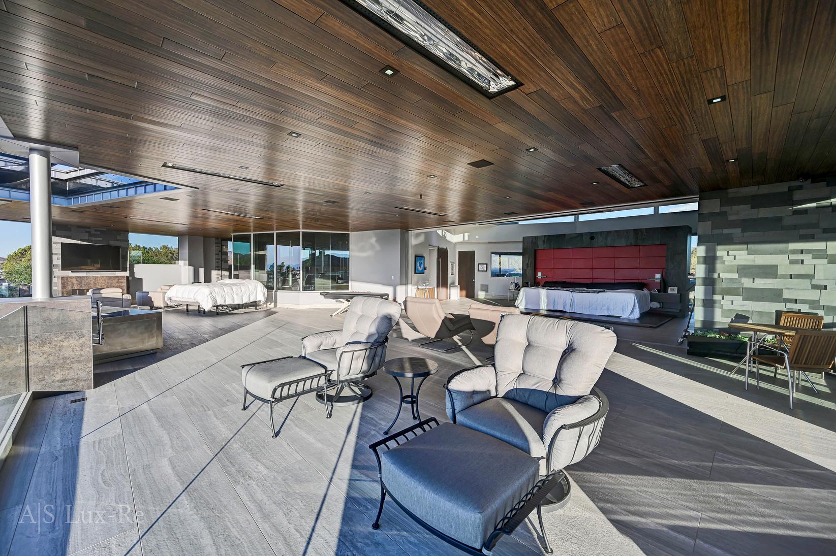 Primary suite has a vast skylight, strip & Golf Course Views, as well as large dual sided projector screen