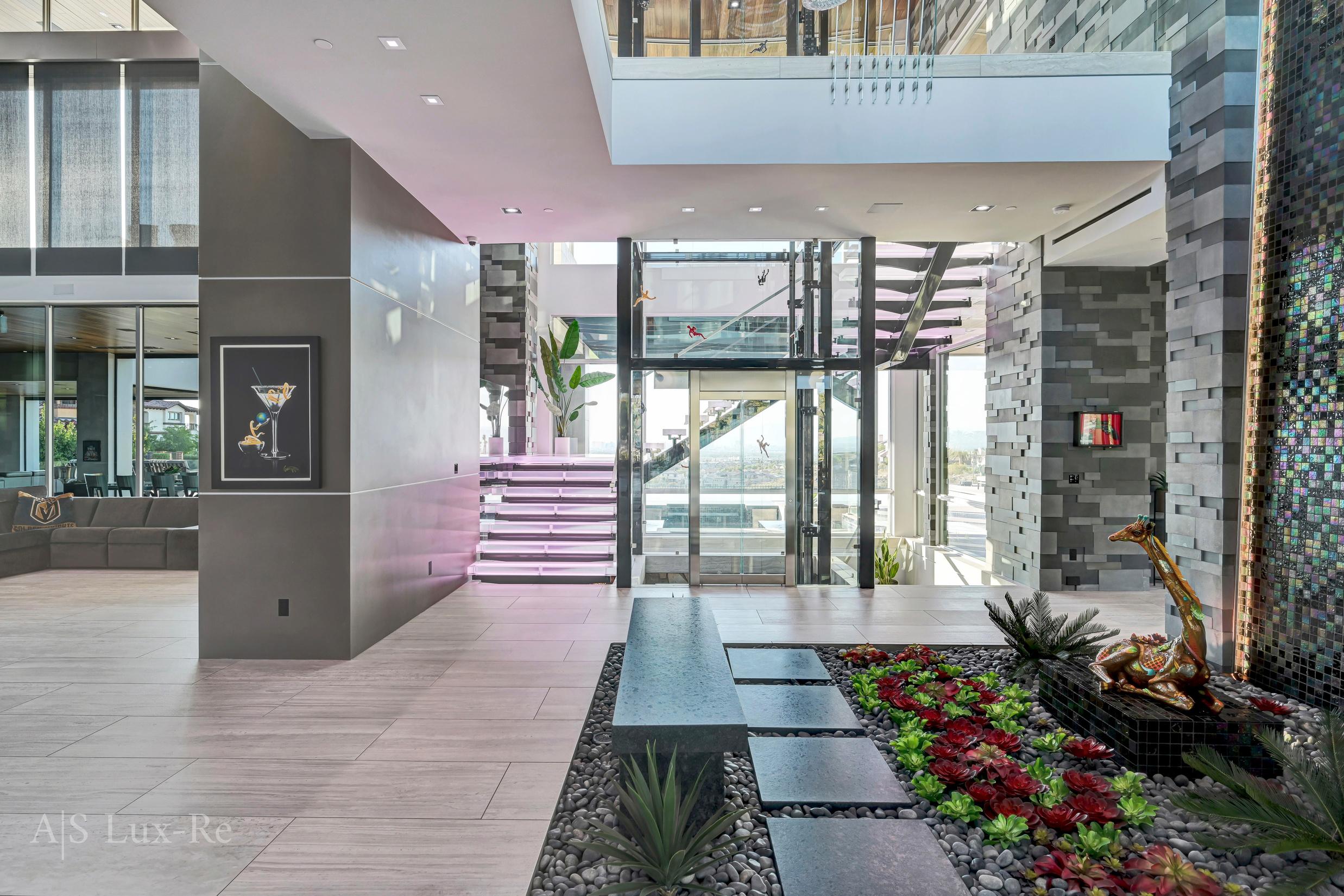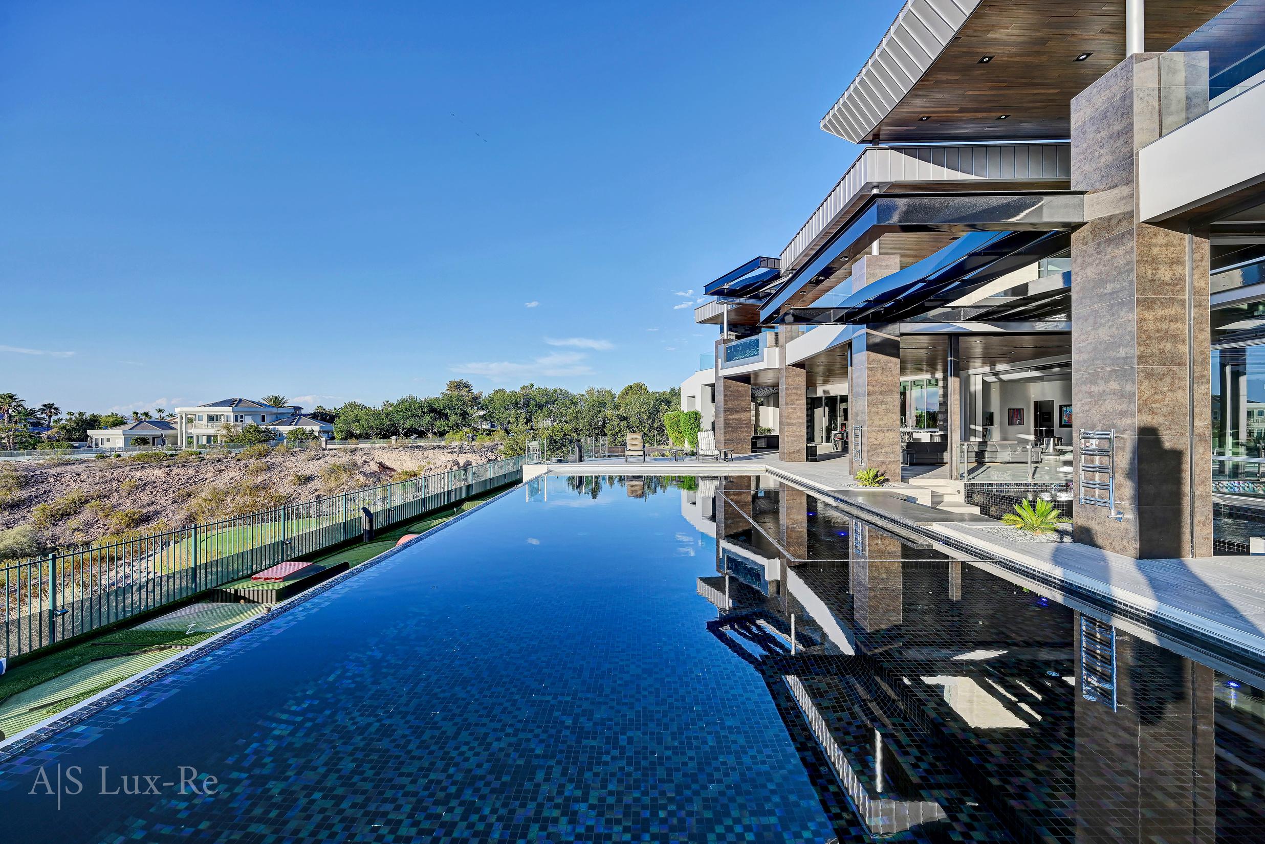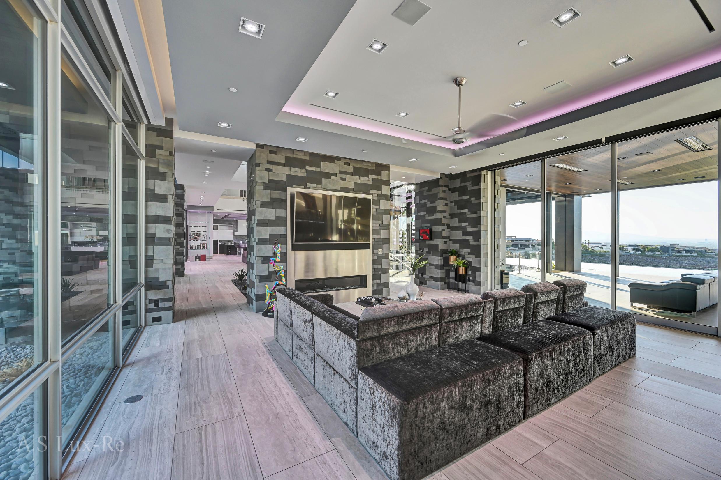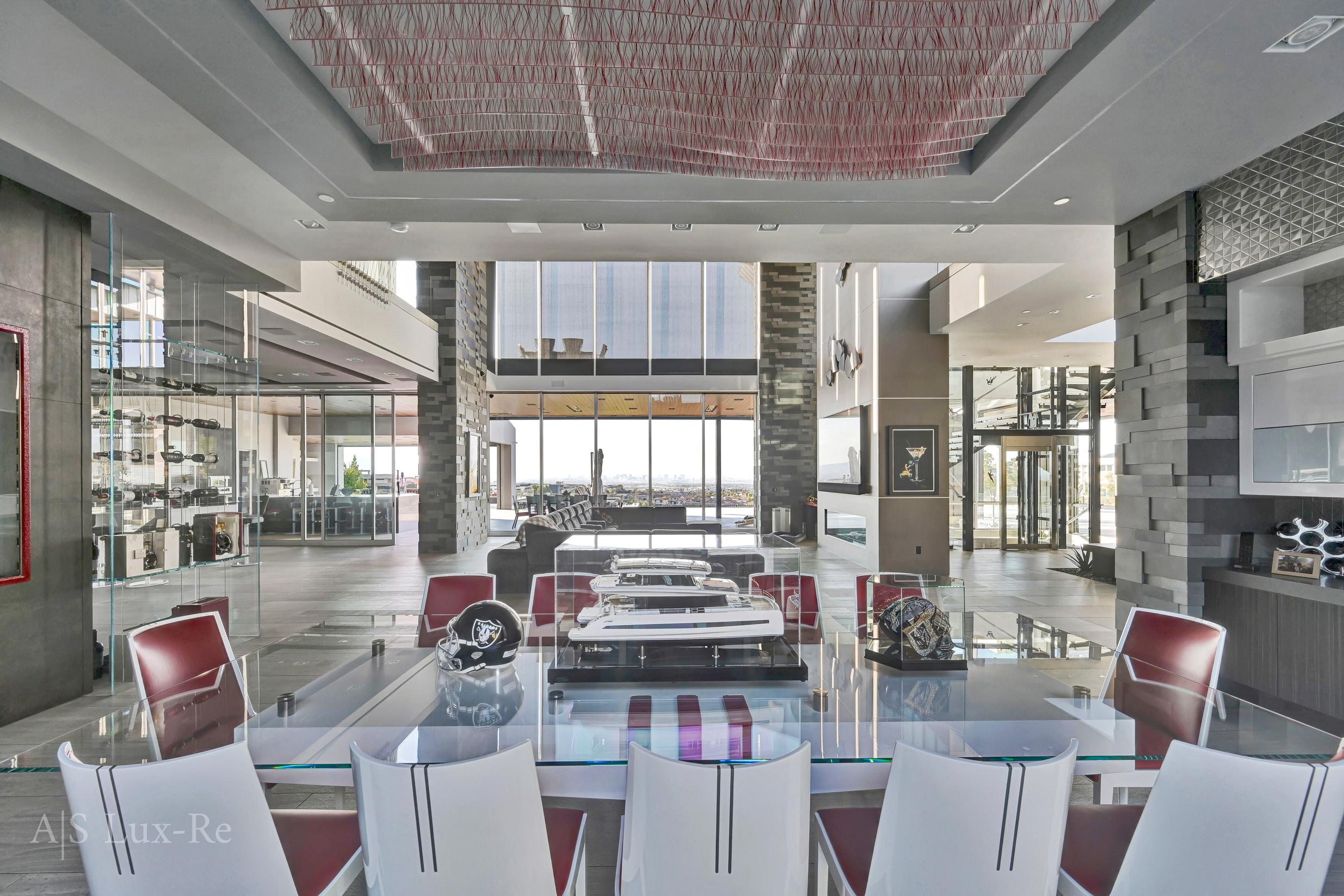 Primary suite has a vast skylight, strip & Golf Course Views, as well as large dual sided projector screen