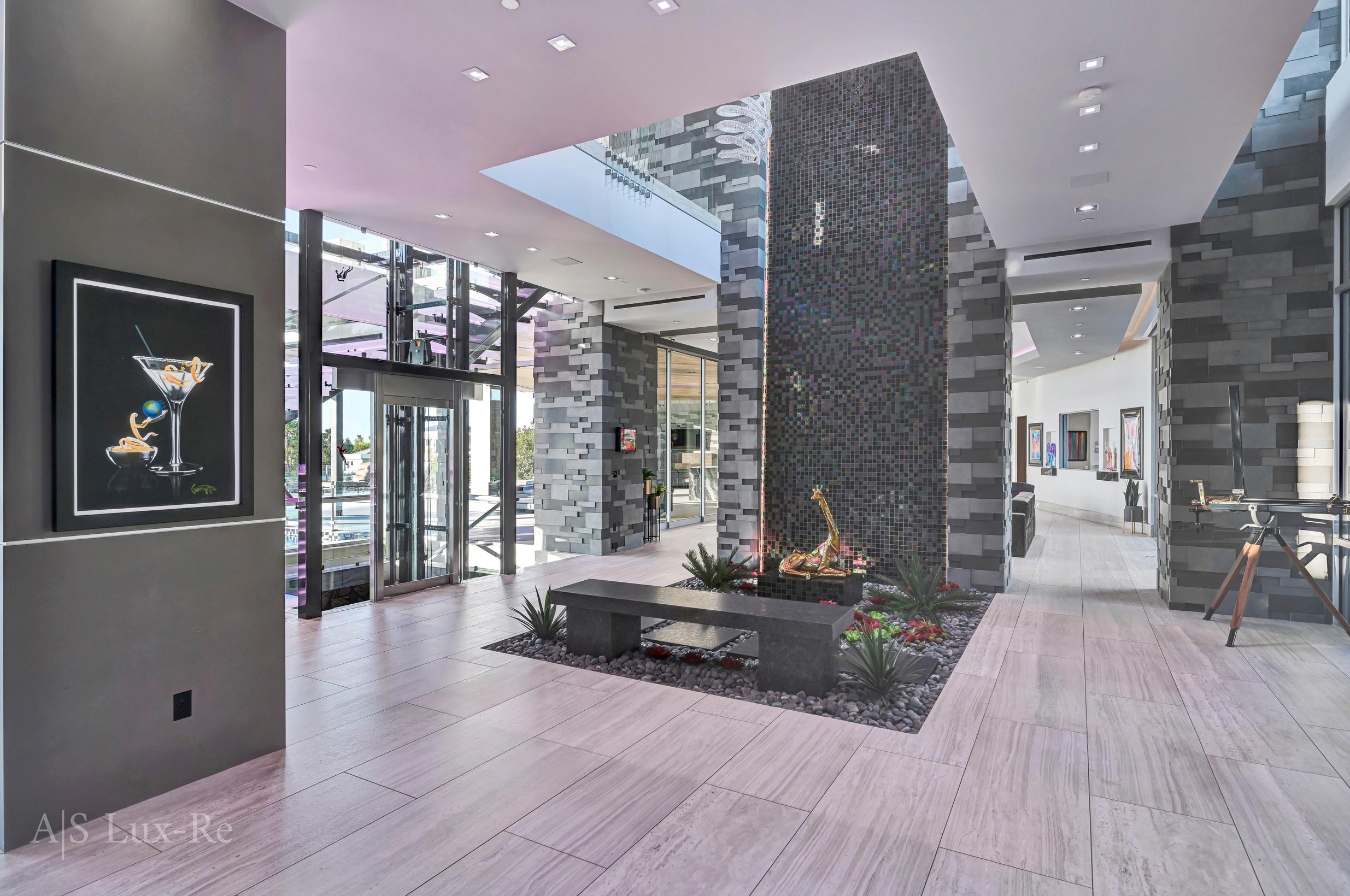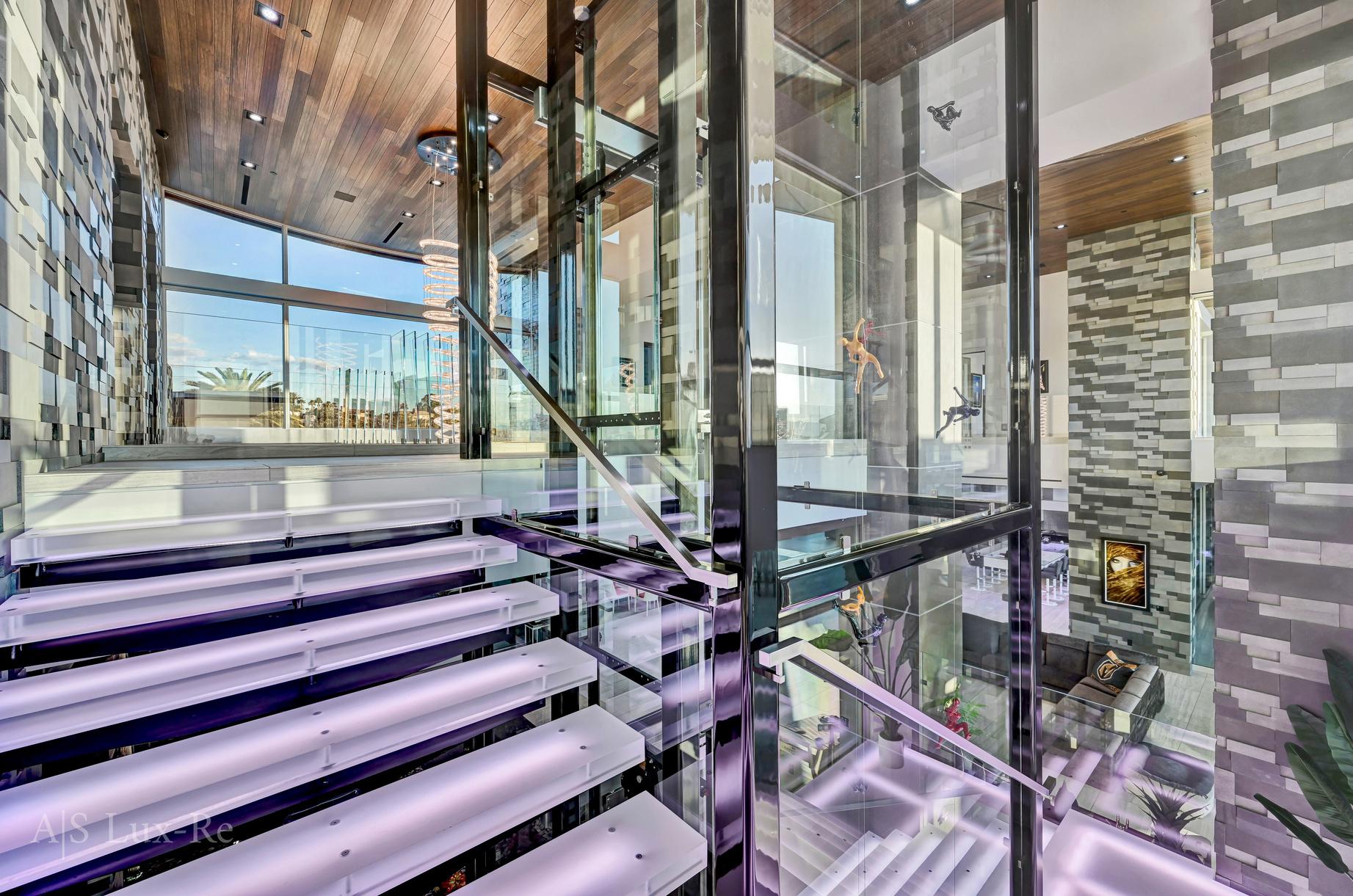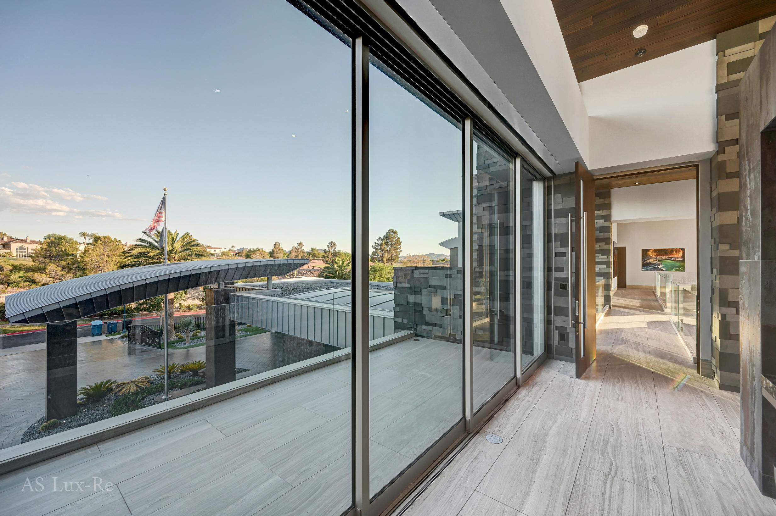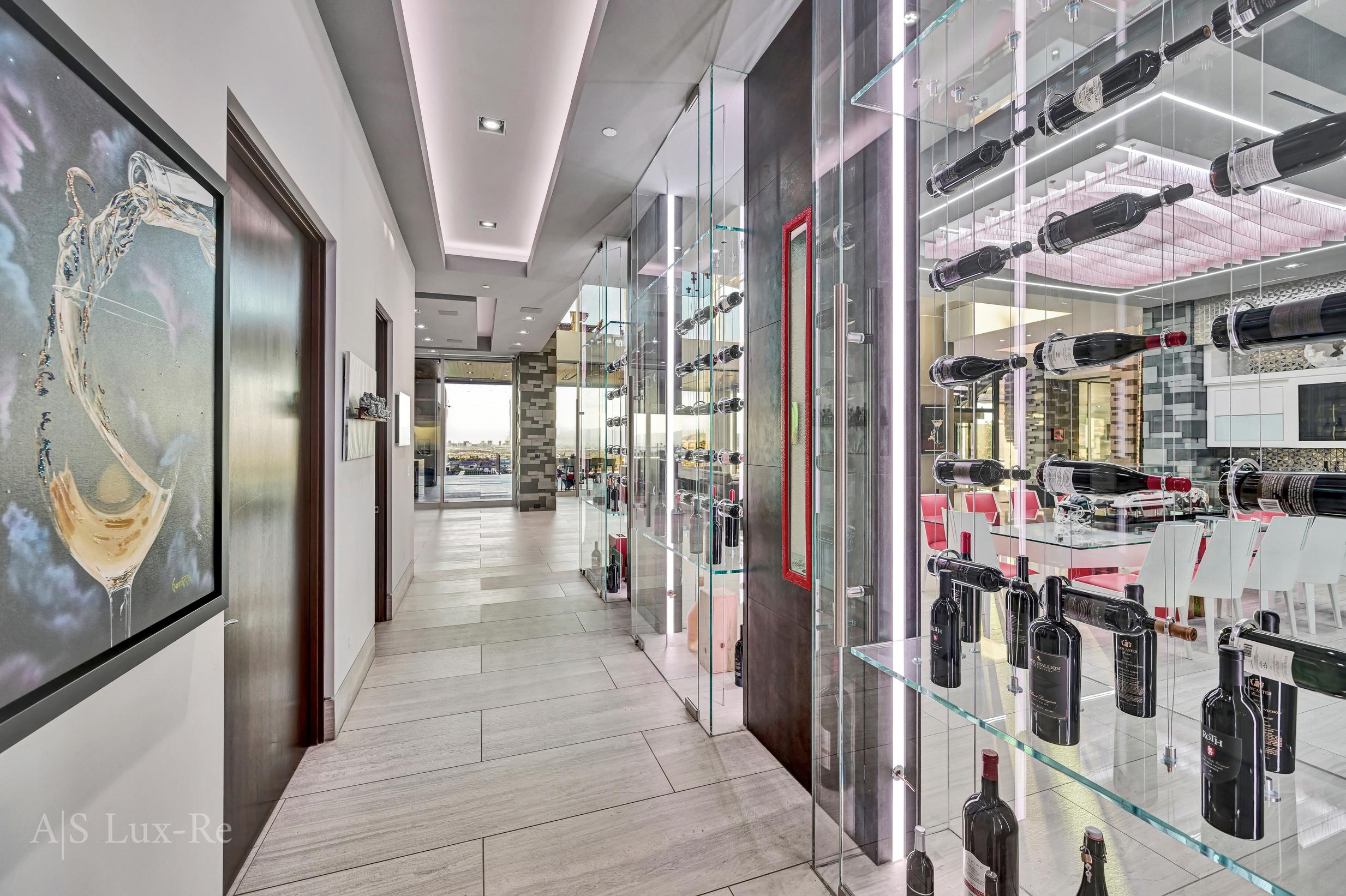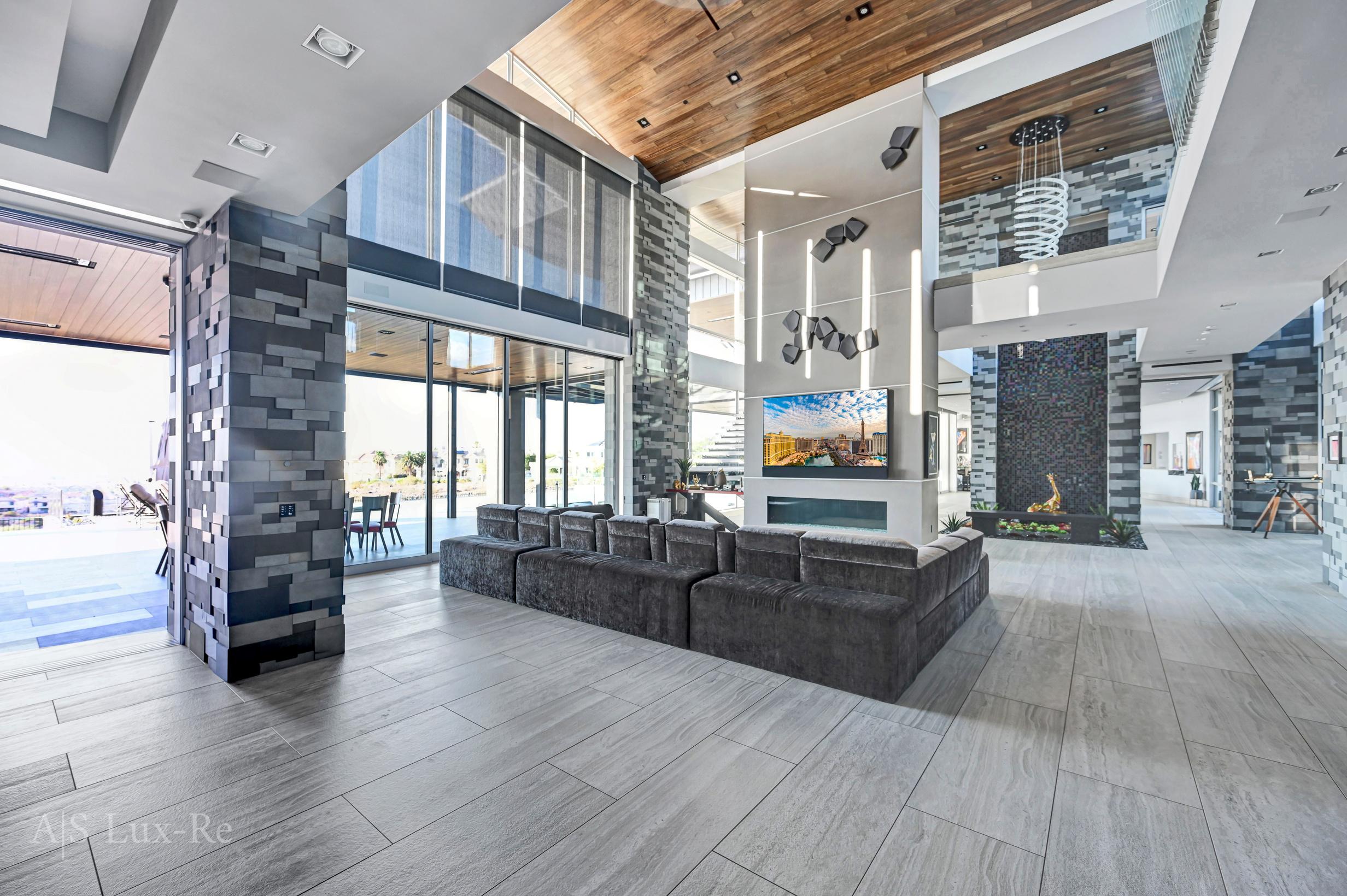 Primary suite has a vast skylight, strip & Golf Course Views, as well as large dual sided projector screen