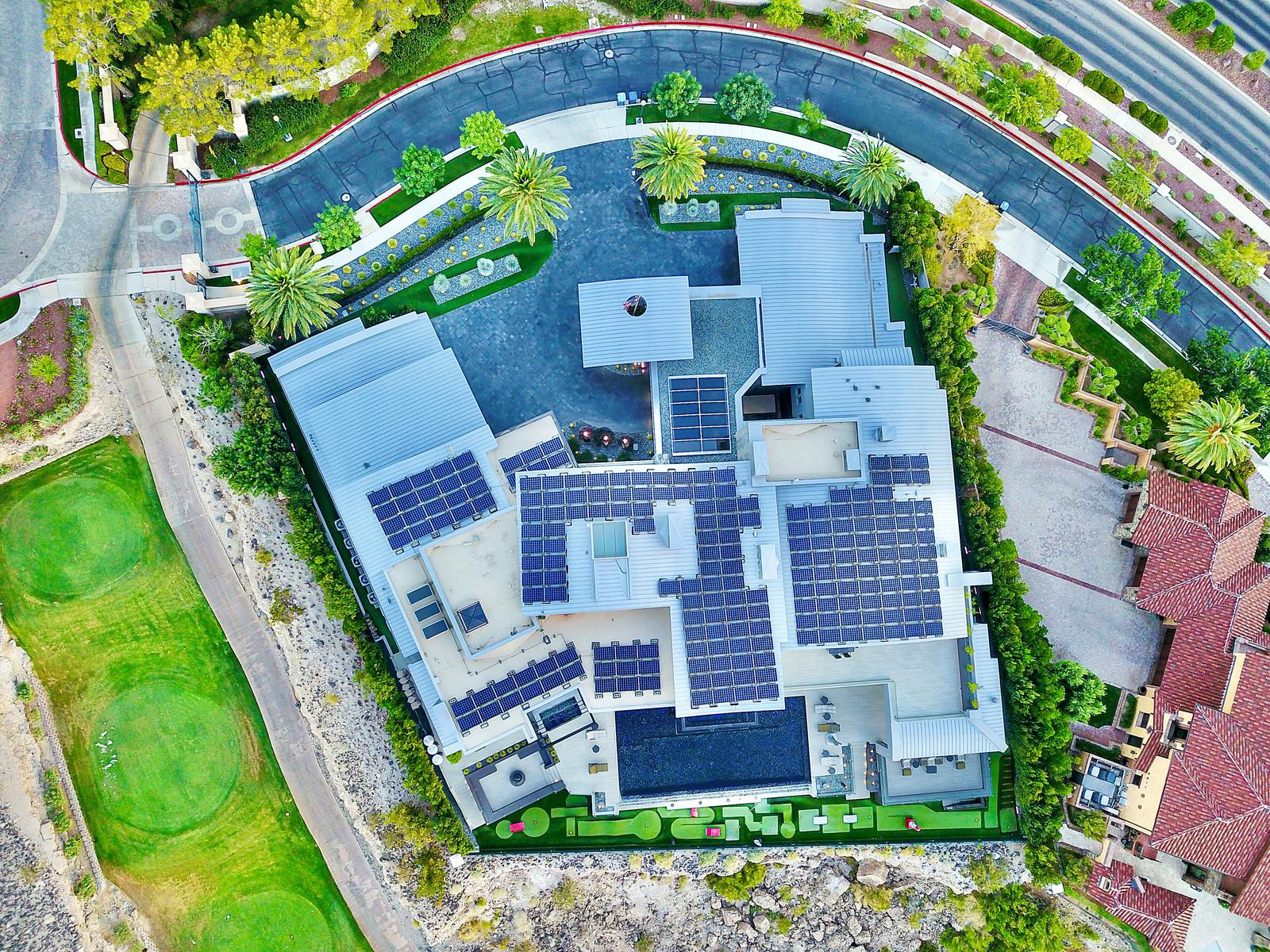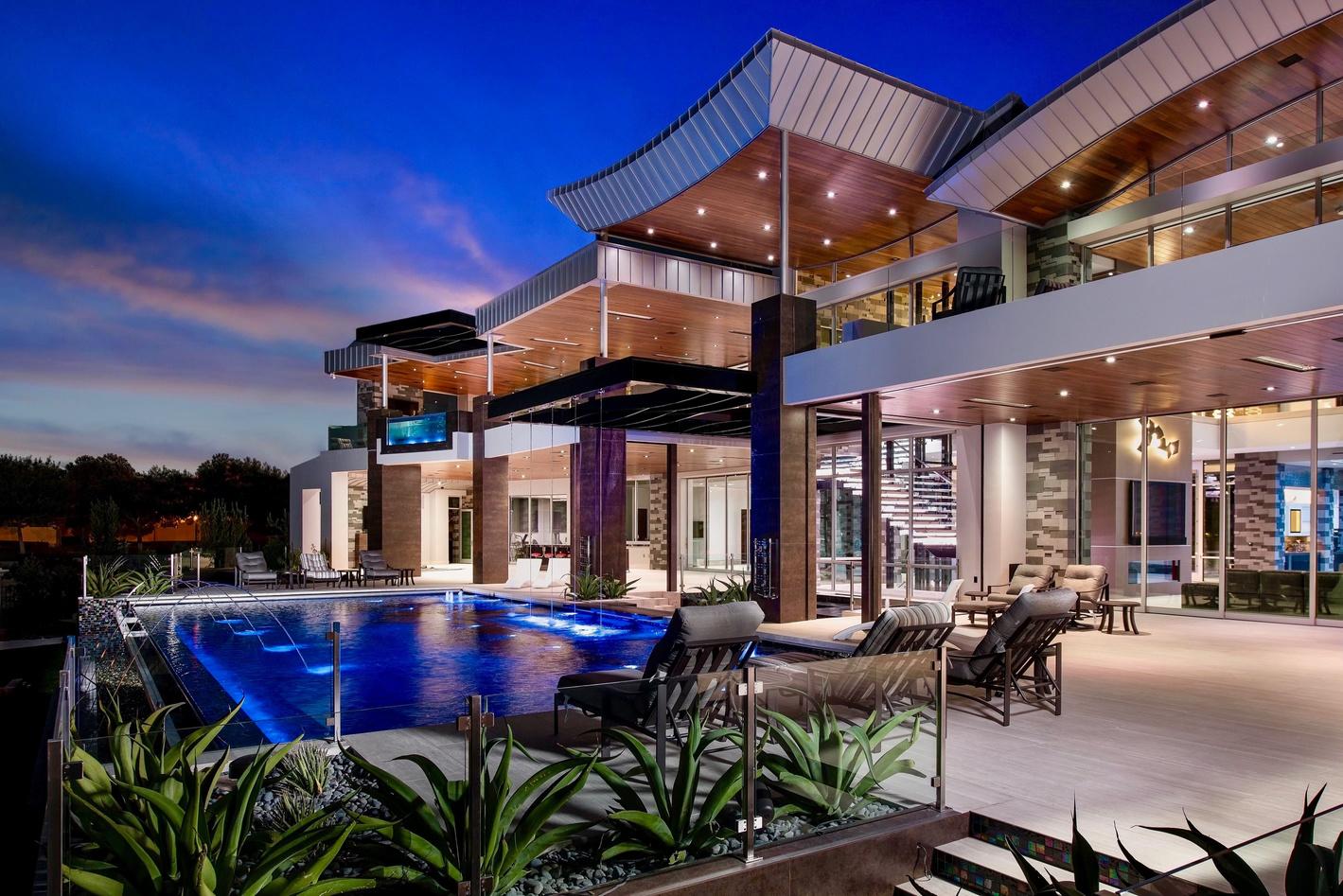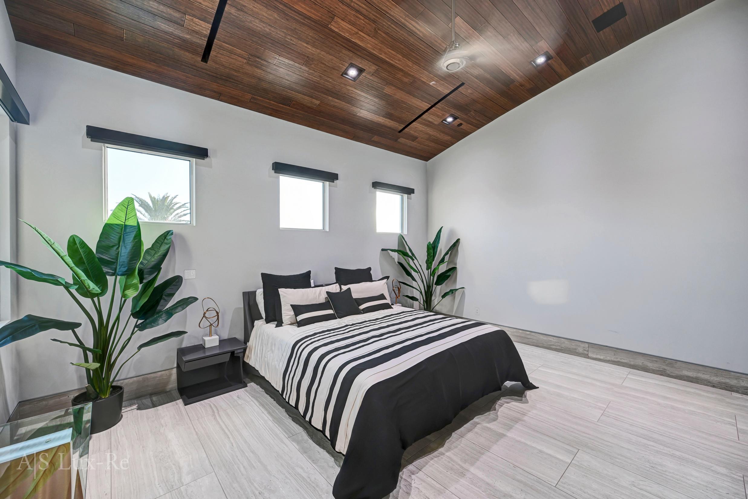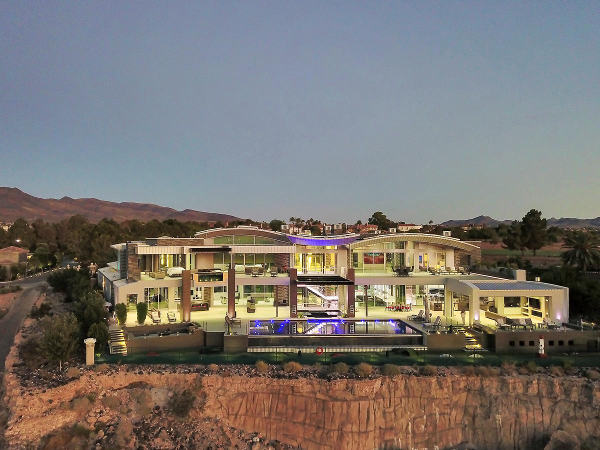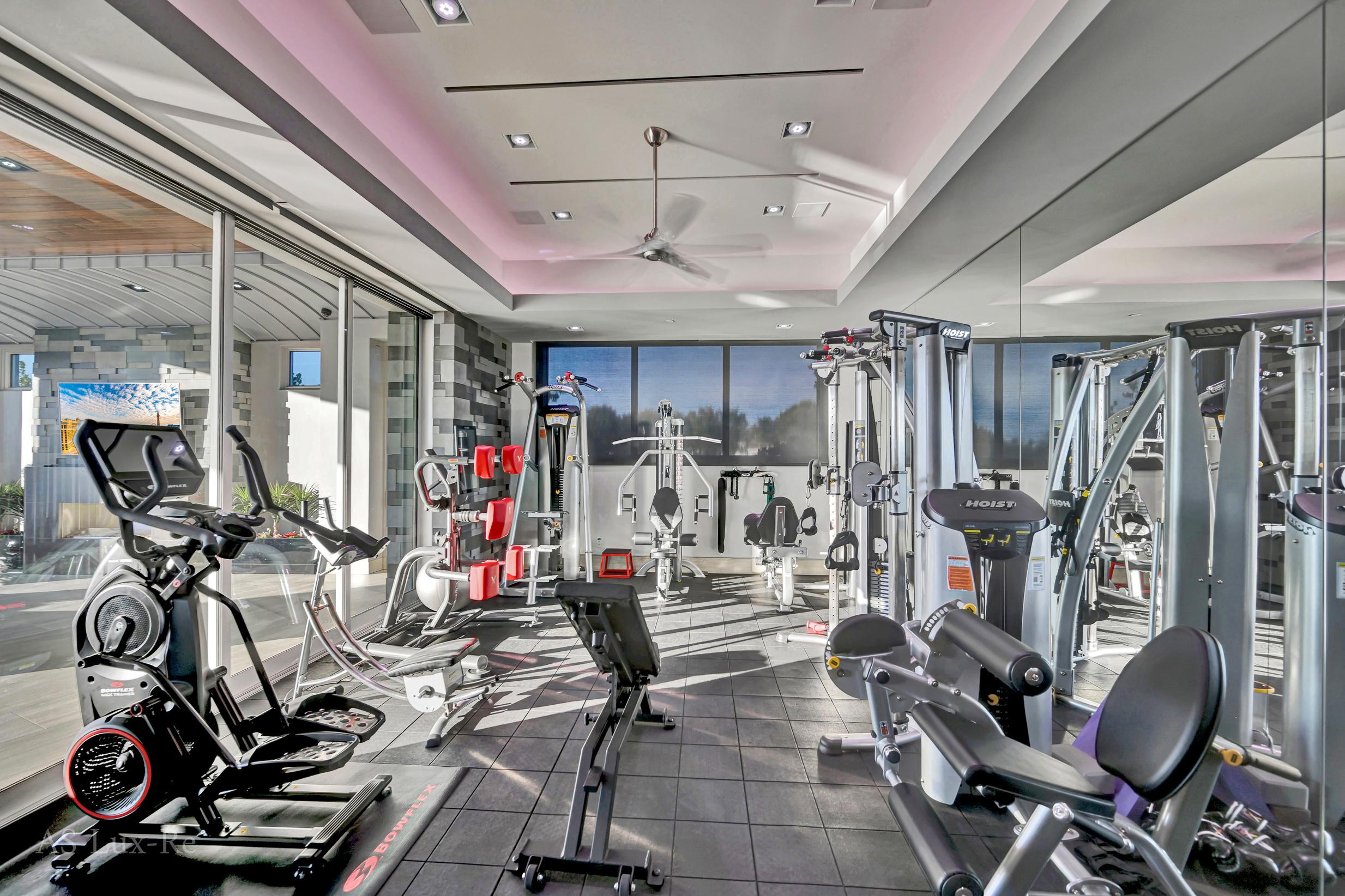 Primary suite has a vast skylight, strip & Golf Course Views, as well as large dual sided projector screen