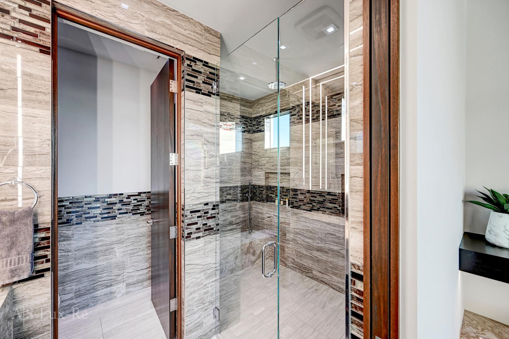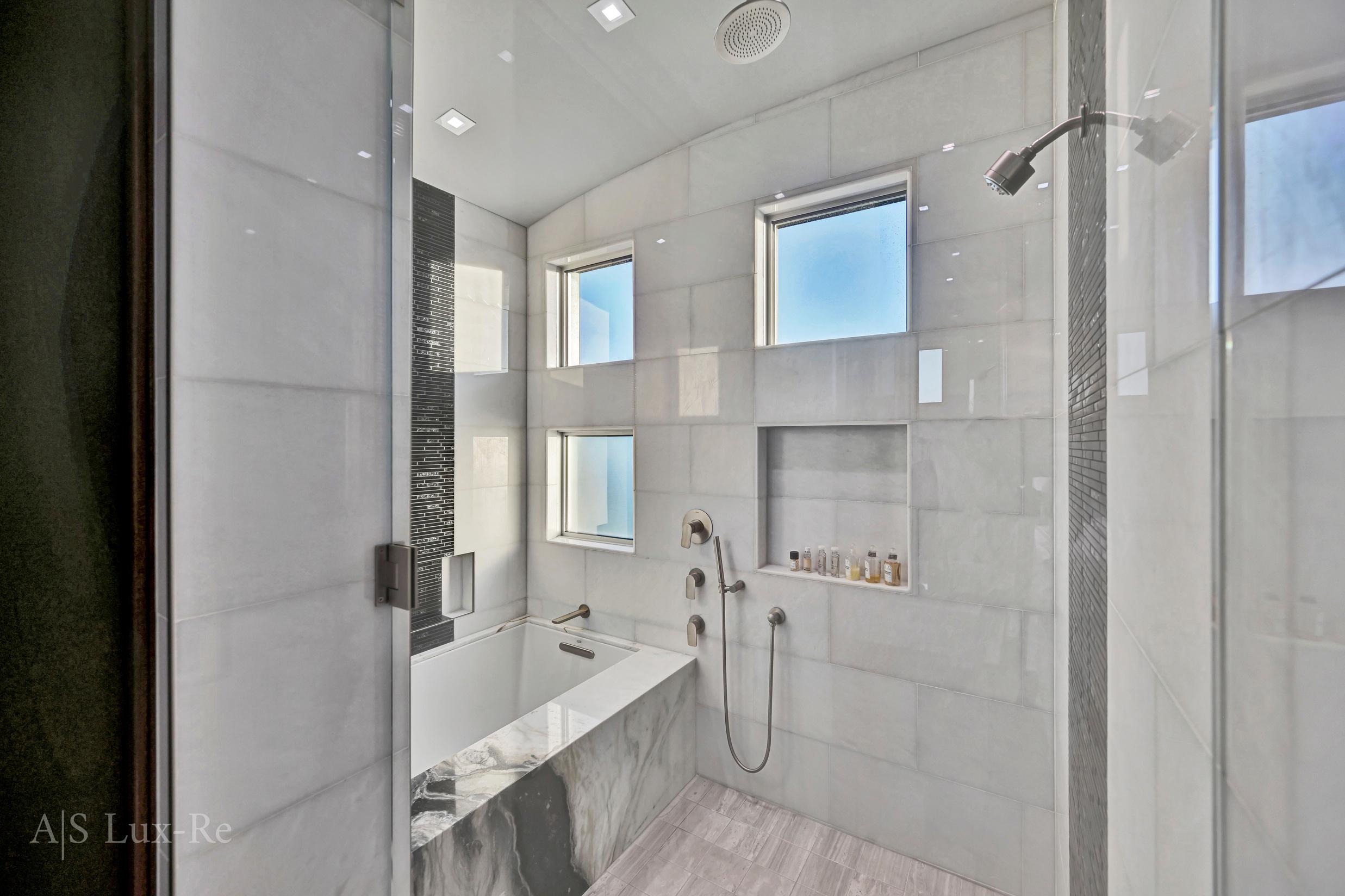Indoor shower has 43 shower heads, steam feature, custom tile throughout & city views