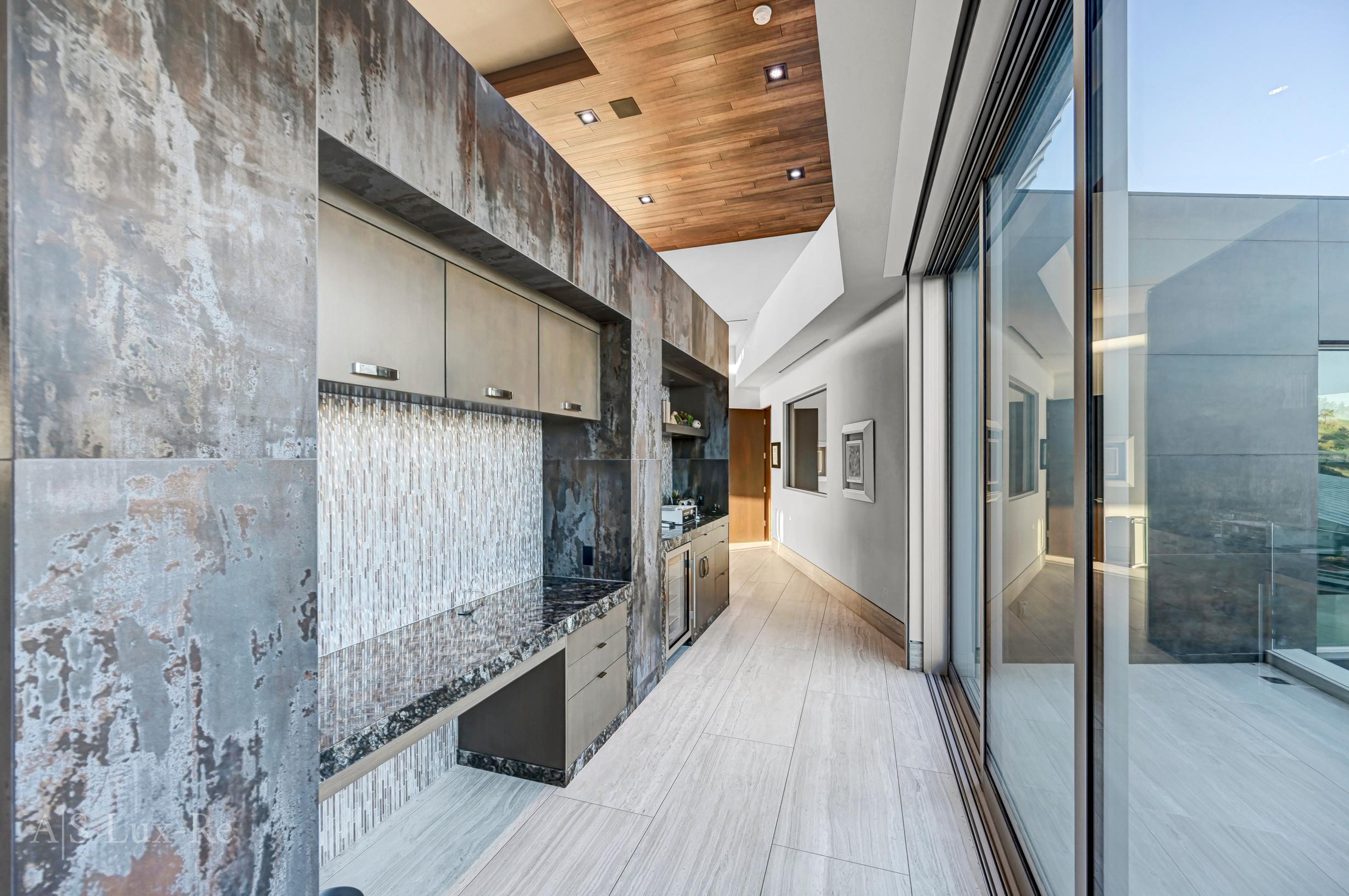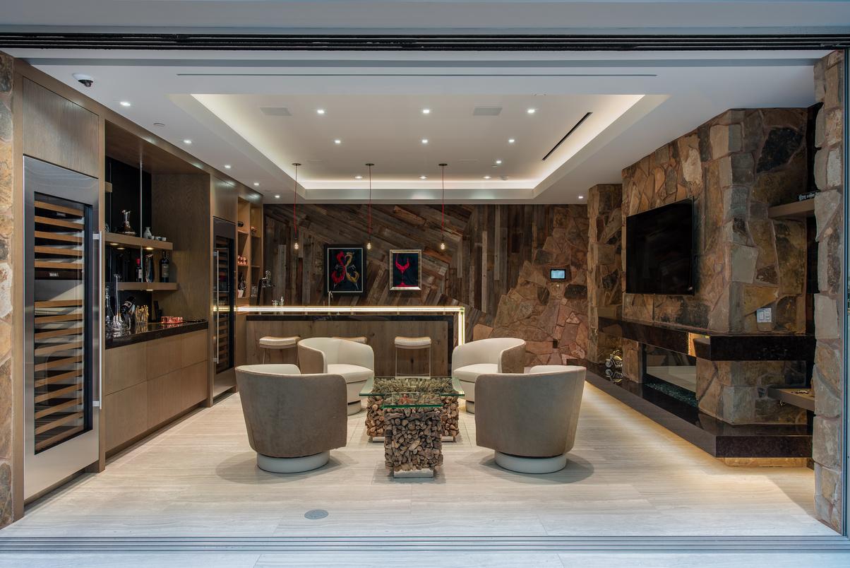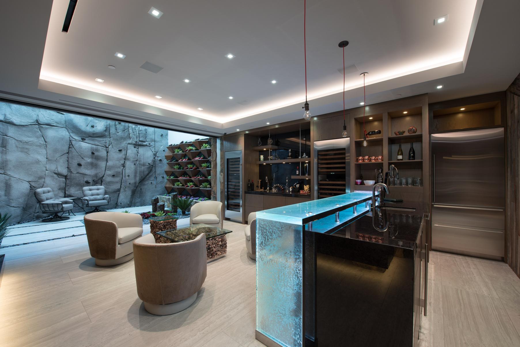 Basement level of the home features bar, seating area, and pocket doors open to outdoor rock climbing wall