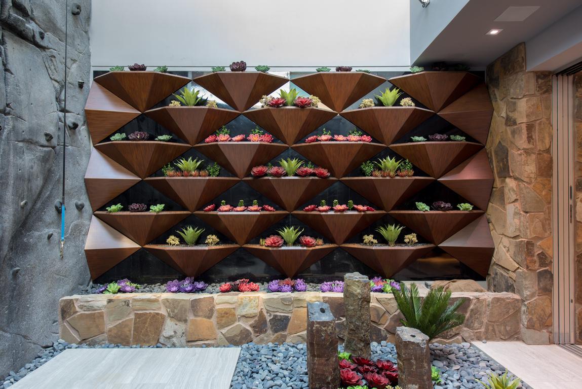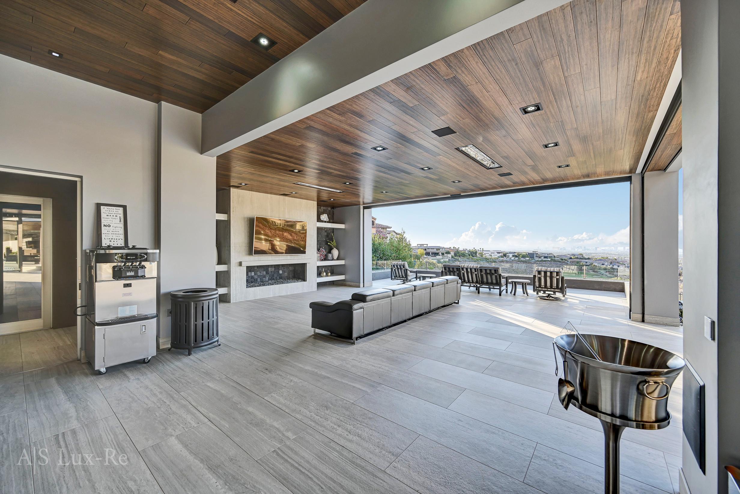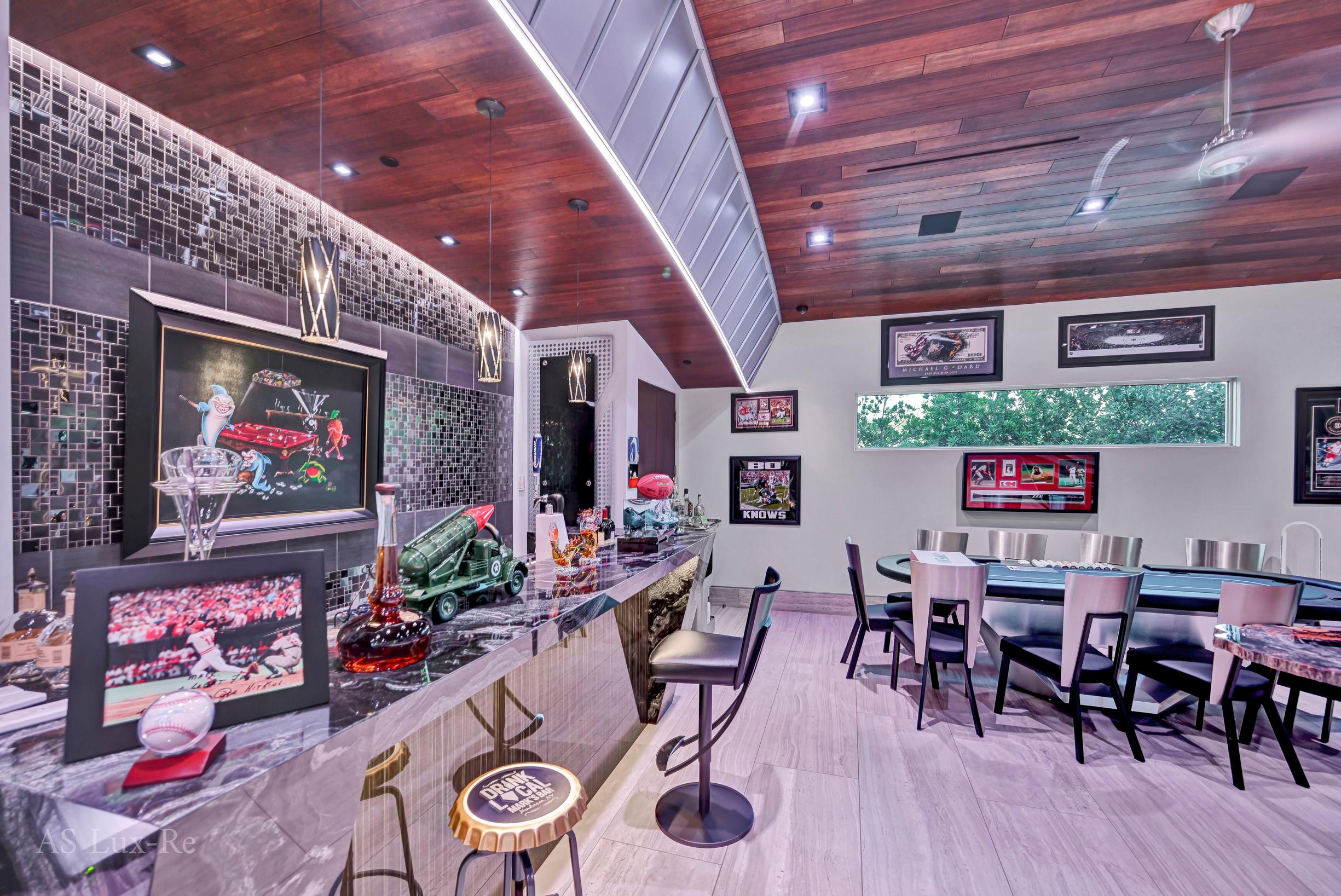 Basement level of the home features bar, seating area, and pocket doors open to outdoor rock climbing wall