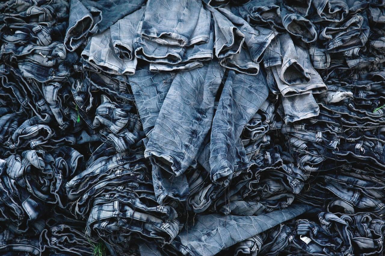 Le jean est découpé en bandes de 1,5 cm qui se placent sur le tulle. Chaque bande est collée puis les galons de broderie sont placées