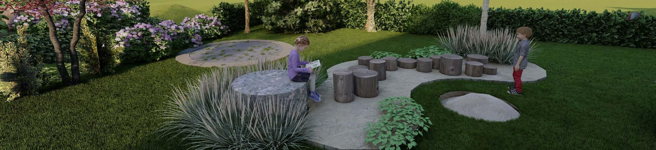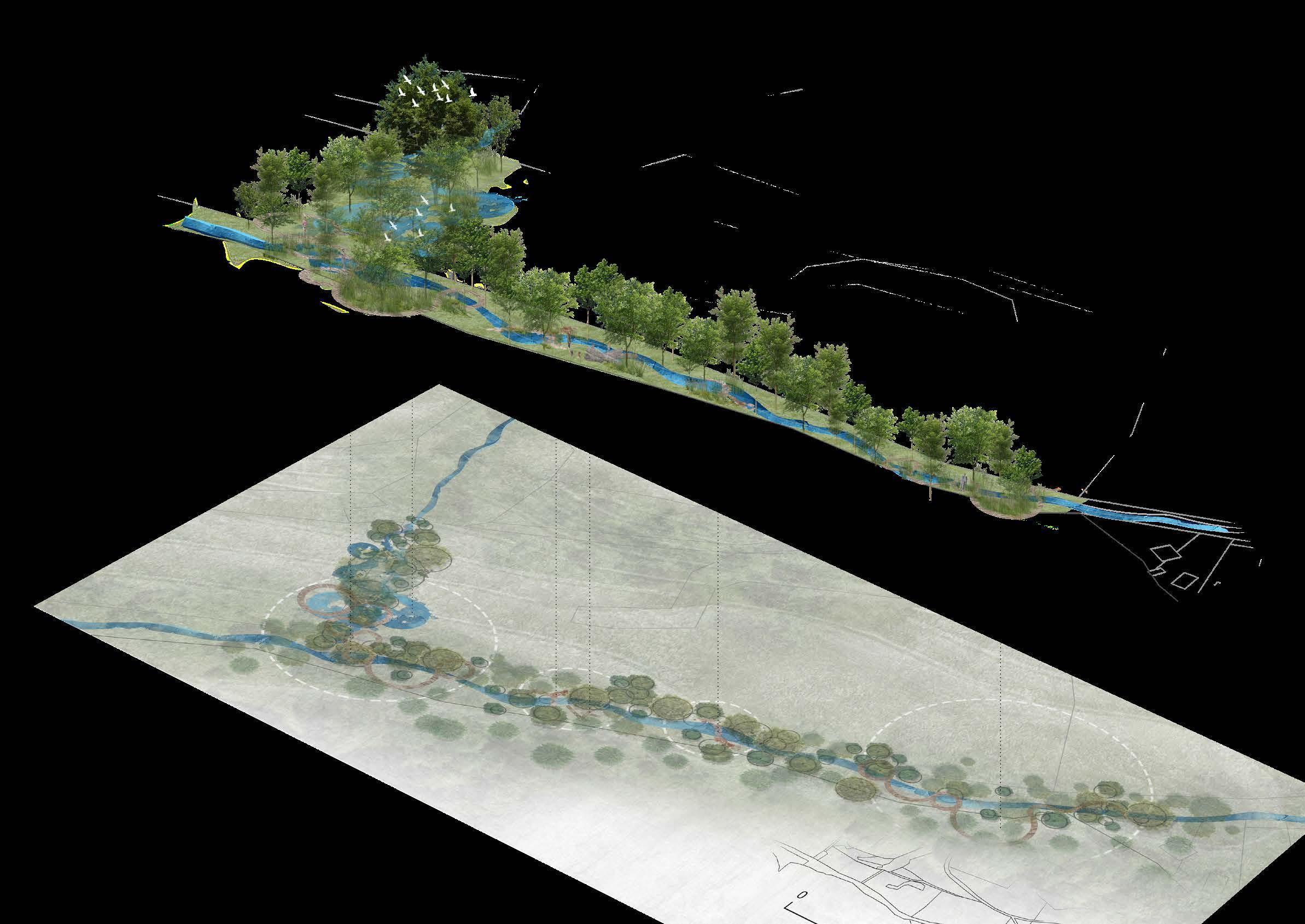 The concept includes improvement of the water detention in the landscape and design of natural playground elements, that support children´ s physical and mental development. The proposal is devided into three layers:
