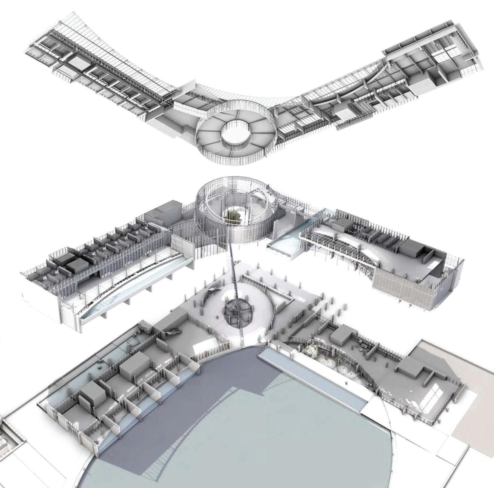 The intervention in the 65-acre farmland in Woodland, GA, will enhace the connection between nature and its natural processes and systems with personal well-being and pleasure. This proposal is a Wellness/Spa center mainly composed of 2 buildings, pools, a reflecting pool, gardens, and farms. The composition in this specific part of the site is to reinforce the idea of moving water from the highest point to the lowest, making it go through the building, then the reflecting pool, and back to nature by depositing it in the existing pond, acting as a cascade when it rains. Furthermore, filtering the occupiable pools with natural elements, so the water can go back to nature, or be used in the gardens and farms. The building enhances the conection beteen people and nature by creating different sppaces of occupation where different senses can be activated by the relation of the building with the surrounding natural conditions.