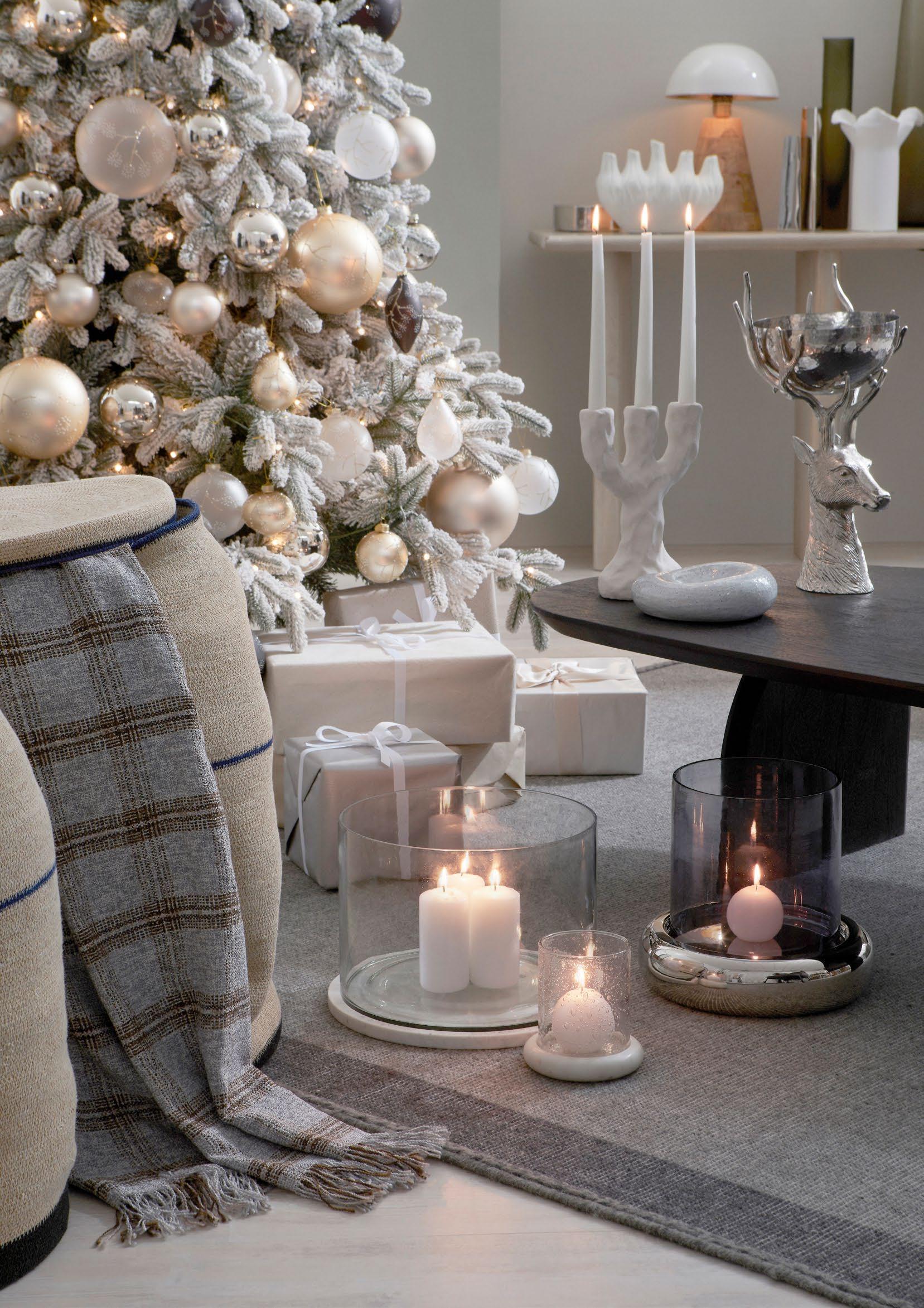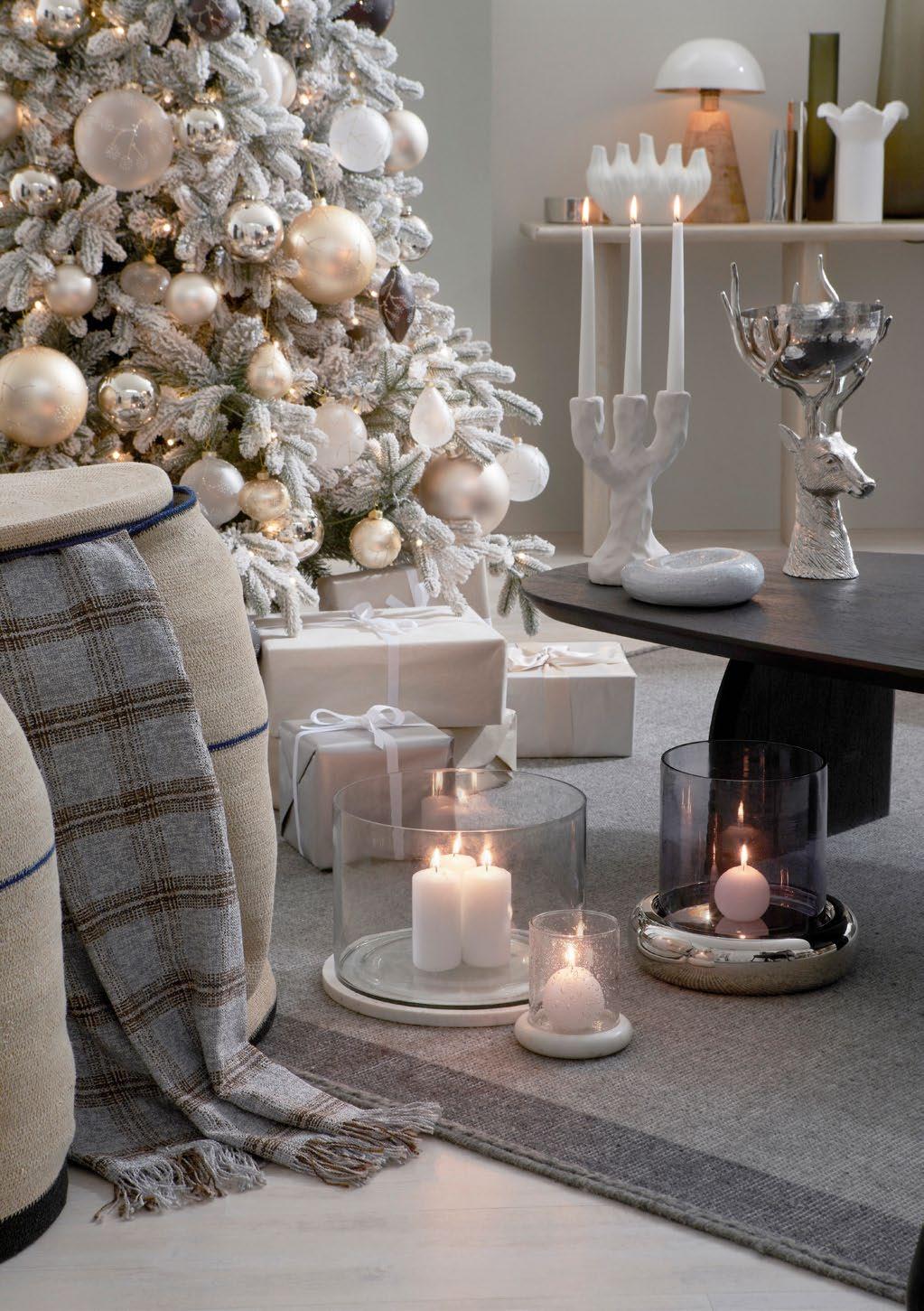 Il Natale classico della tradizione. Palette: bianco, argento e grigio vaporoso.