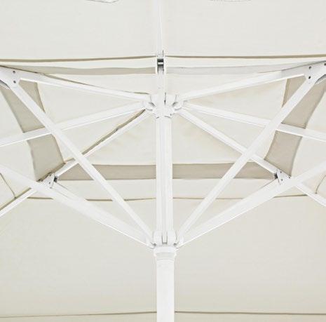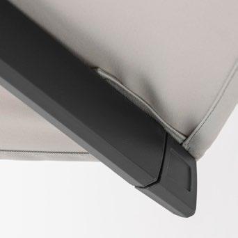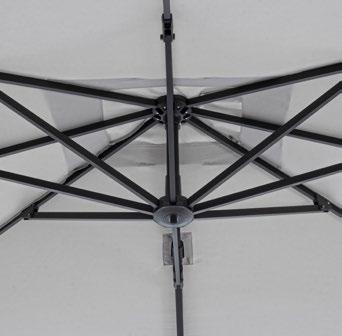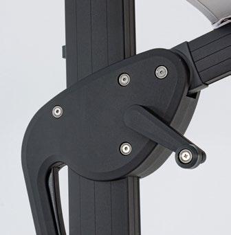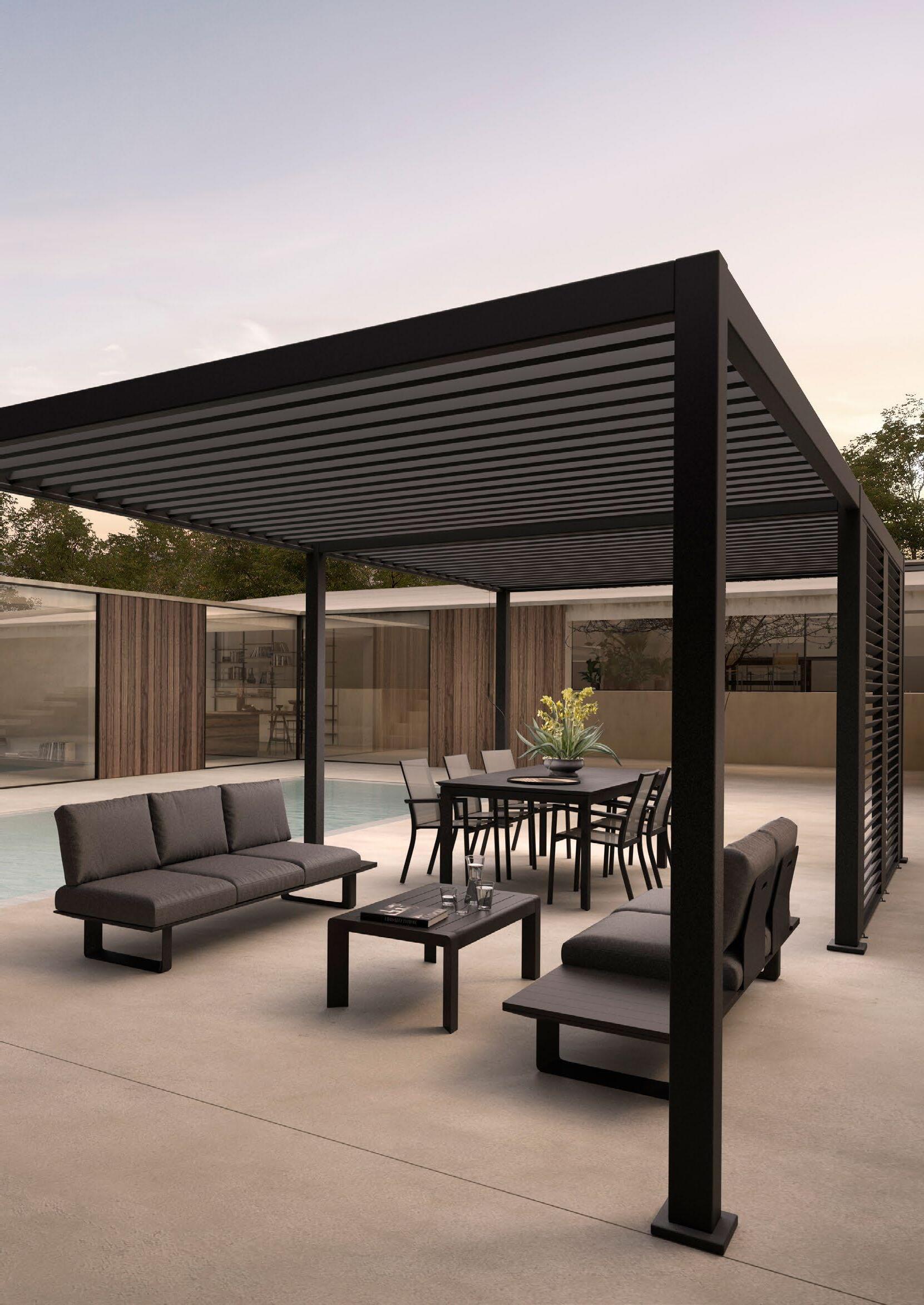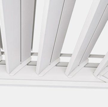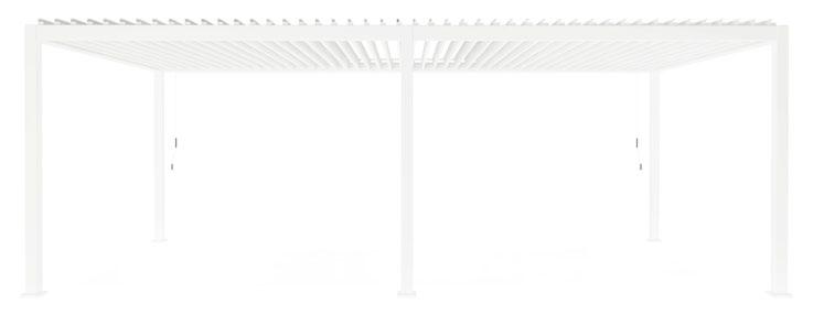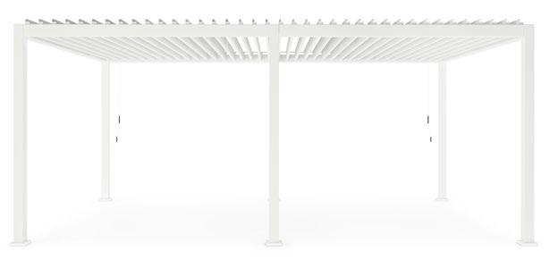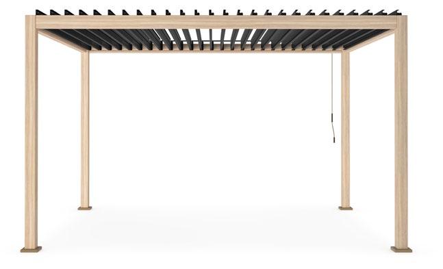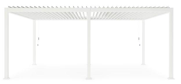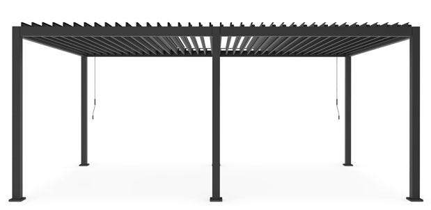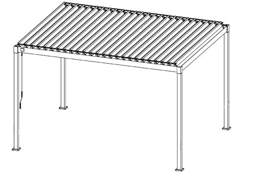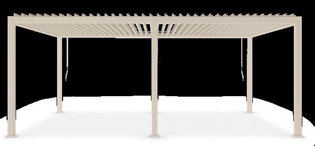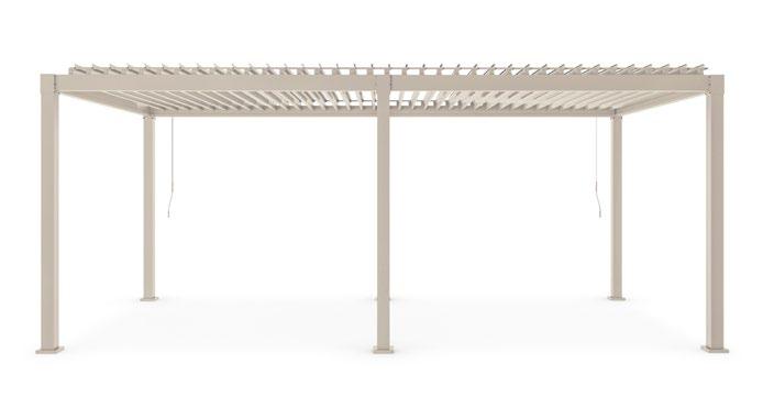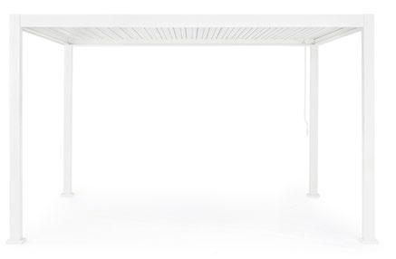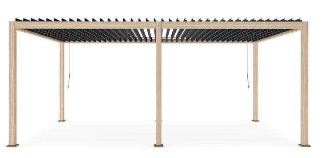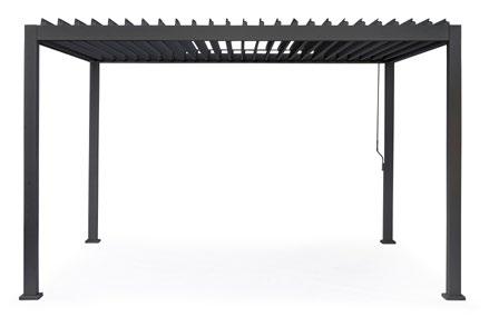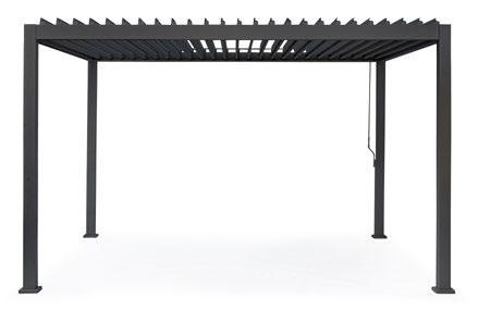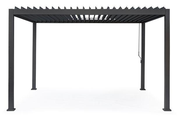 Struttura in alluminio verniciato a polvere (poliestere). Pali portanti 111x111mm, traversi 140x75mm. Tetto lamellare orientabile tramite manovella. Cod. 0795783 e 0795784 con due manovelle, ogni manovella consente il movimento indipendente del singolo settore. Lame frangisole a doppio strato 173x30mm. Sistema di deflusso dell’acqua integrato all’interno dei pali portanti. Viteria in acciaio inossidabile. Da assemblare.