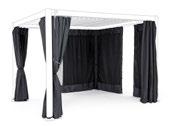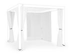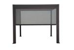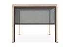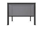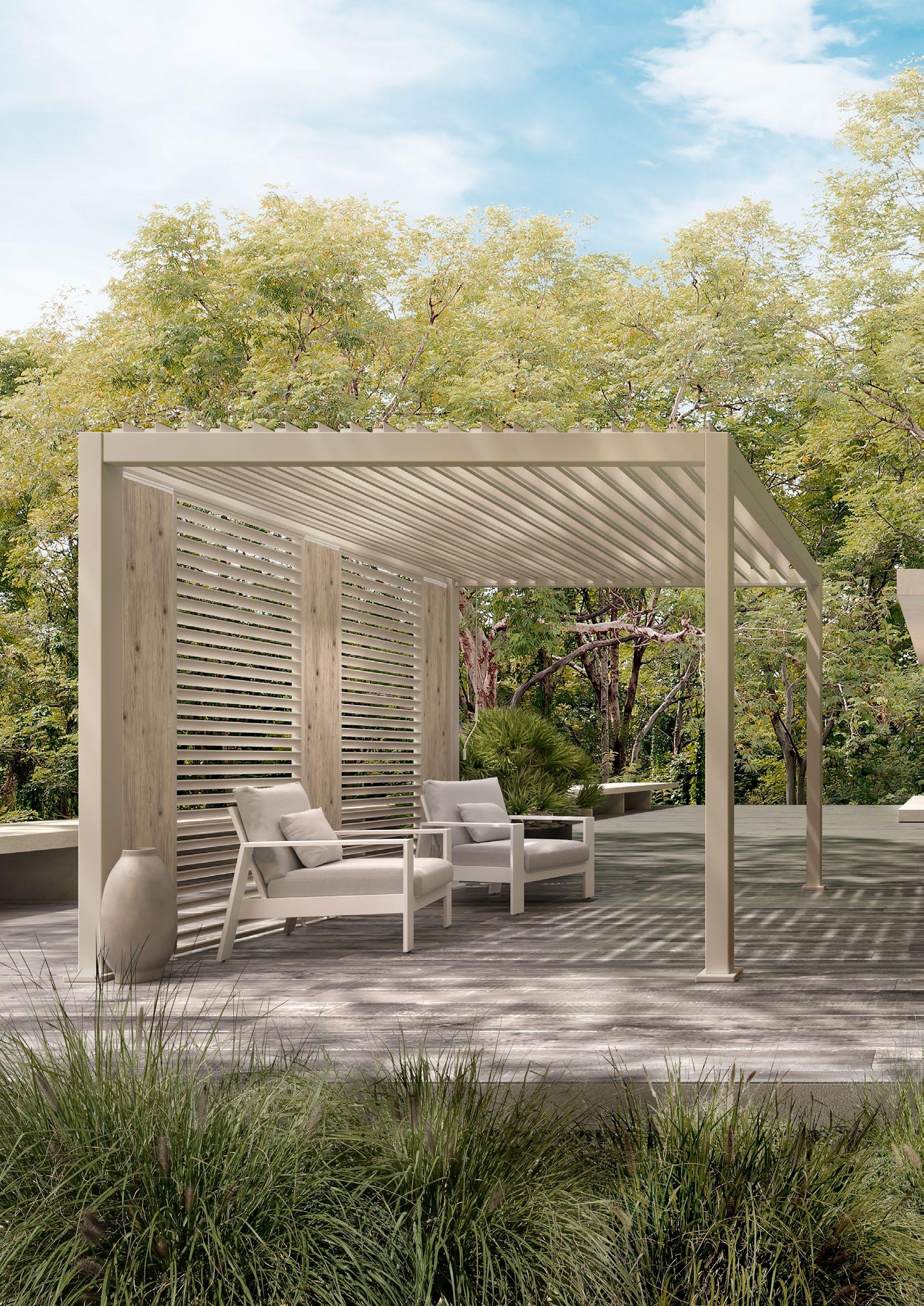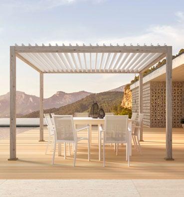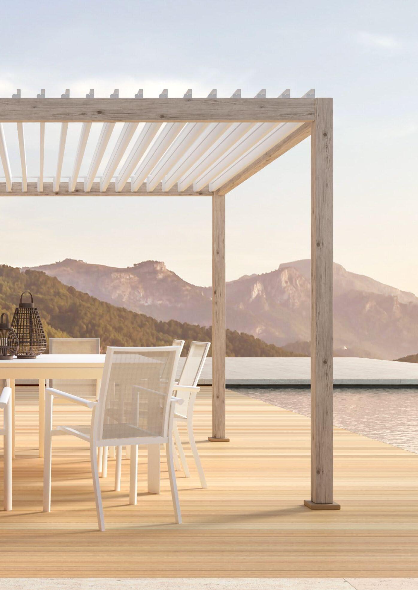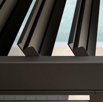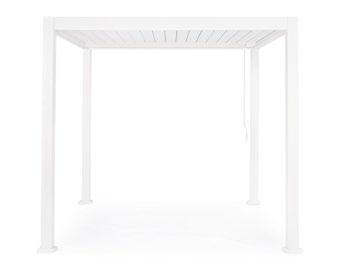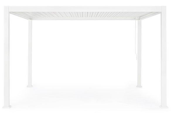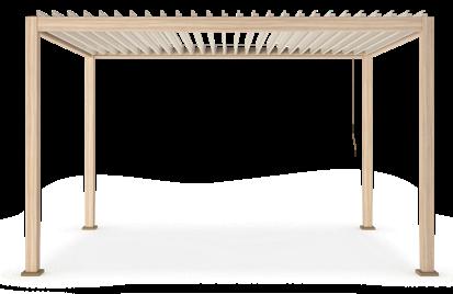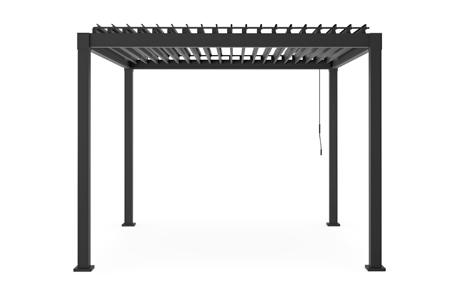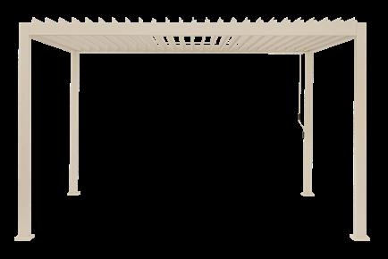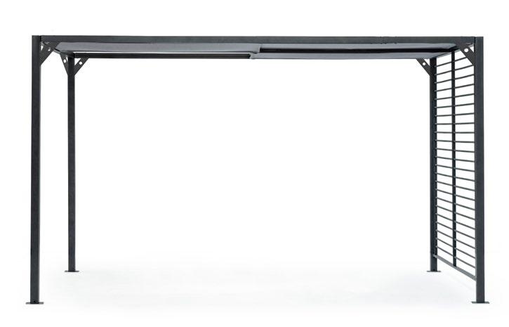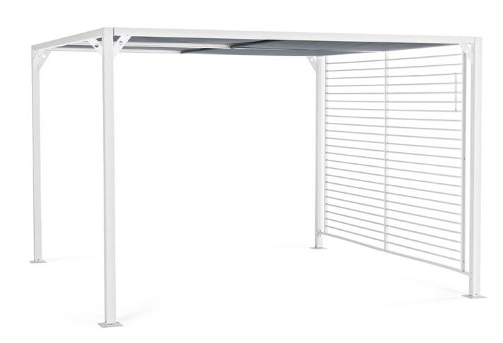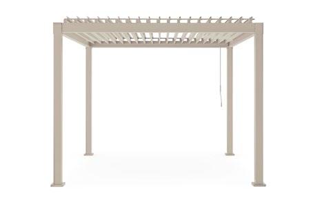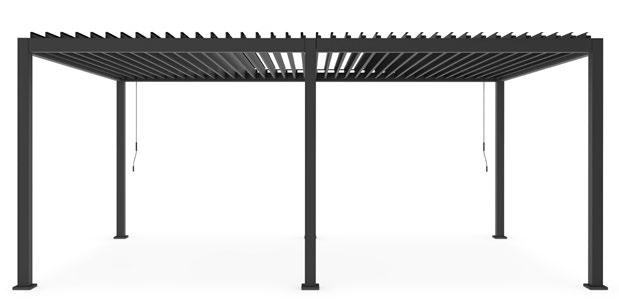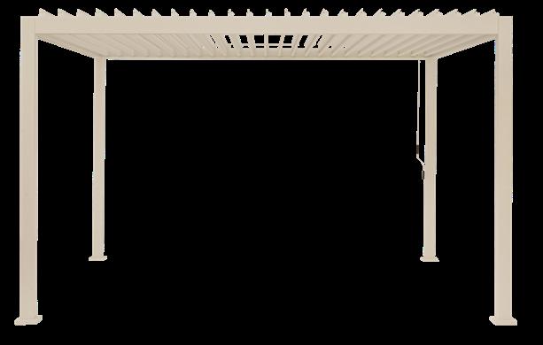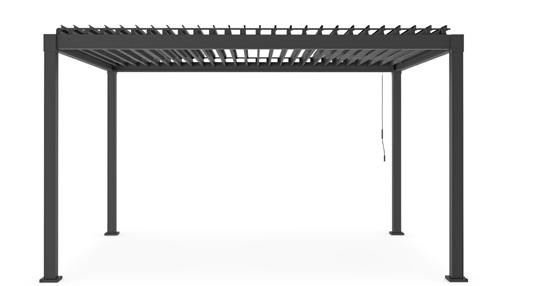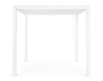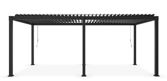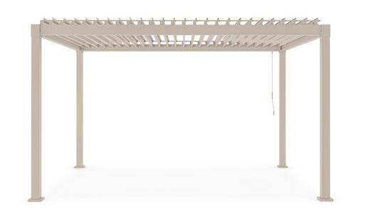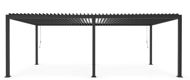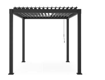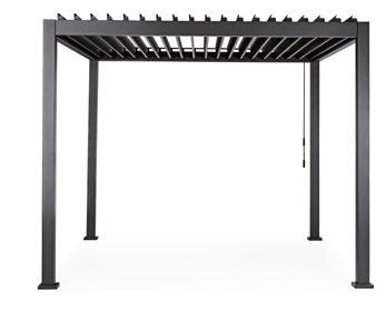 Pergola Marea, struttura in alluminio verniciato a polvere (poliestere). Pali portanti 111x111mm, traversi 140x75mm. Tetto lamellare in acciaio galvanizzato orientabile tramite manovella. Lame frangisole 173x30mm. Sistema di deflusso dell’acqua integrato all’interno dei pali portanti. Viteria in acciaio inossidabile. Da assemblare.