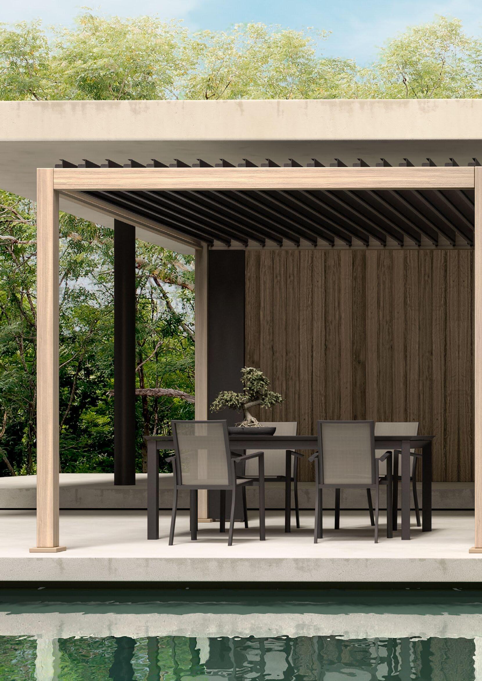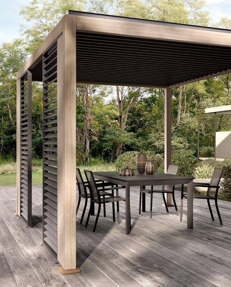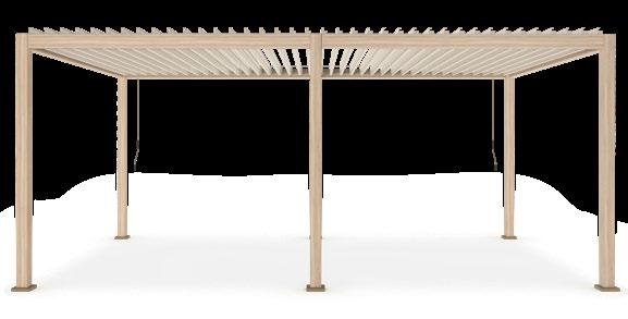 Struttura in alluminio. Pali portanti 111x111mm, traversi 140x75mm. Tetto lamellare verniciato a polvere (poliestere),orientabile tramite manovella. Cod. 0795789 Con due manovelle, ogni manovella consente il movimento indipendente del singolo settore. Lame frangisole a doppio strato 173x30mm. Pali portanti e traversi con applicazione di film in PVC (foglio laminato ad alta tecnologia) stampato in 3D effetto legno venato. Sistema di deflusso dell’acqua integrato all’interno dei pali portanti. Viteria in acciaio inossidabile. Da assemblare.