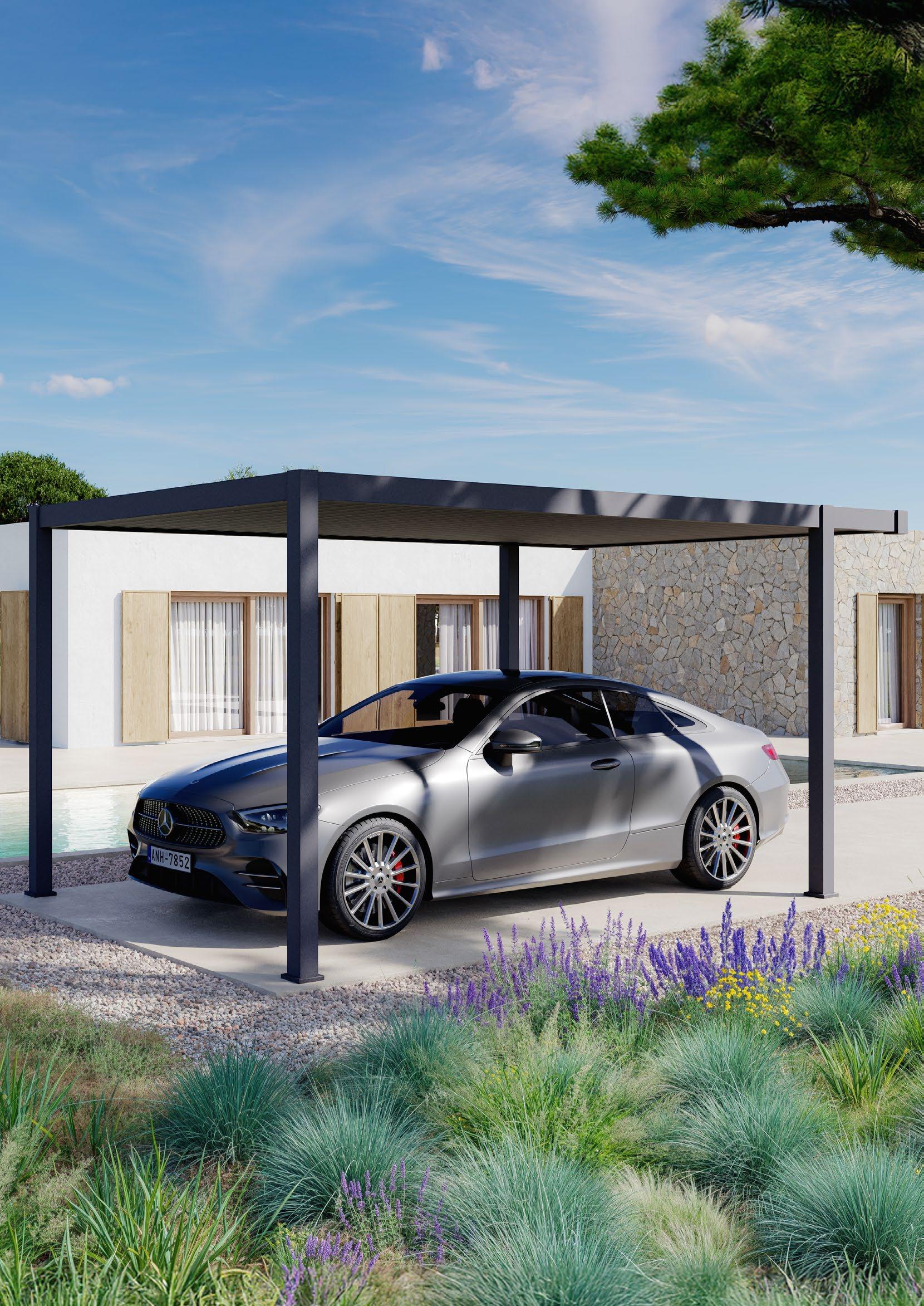 Carport Marea, struttura in alluminio verniciato a polvere (poliestere). Pali portanti 111x111mm, traversi 140x75mm. Tetto lamellare in acciaio galvanizzato.Lame frangisole 172.3x30mm non orientabili. Sistema di deflusso dell’acqua integrato all’interno dei pali portanti. Viteria in acciaio inossidabile. Da assemblare.