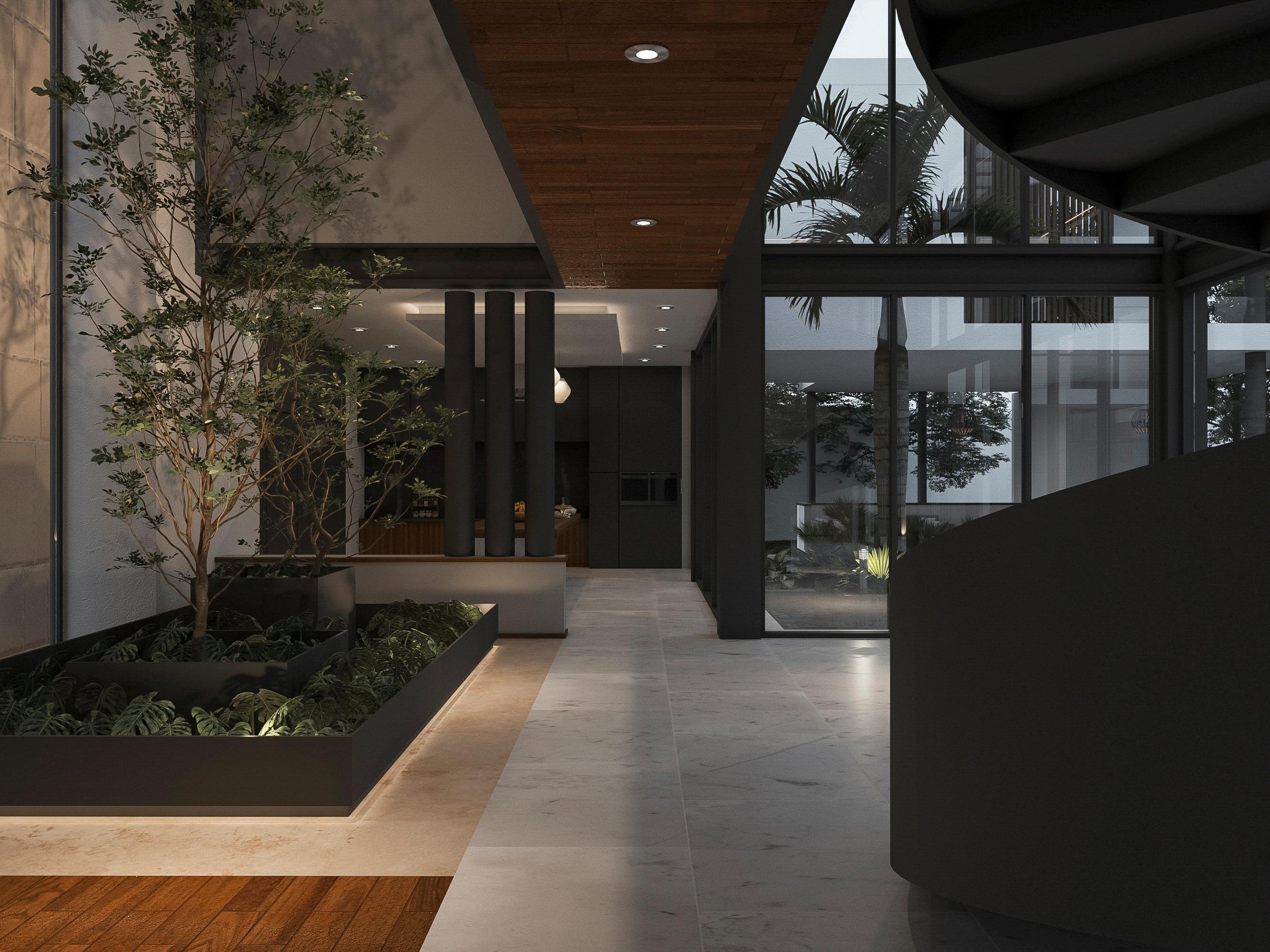 El diseño arquitectónico de la vivienda, taller y galería para un artista en Madrid sigue un estilo brutalista verde. Creando espacios con jardínes interi ores, acabados naturales e iluminación natural, se busca brindar sentimientos de serenidad y armonía, para que el artista encuentre inspiración y con centración para su arte. El primer nivel cuenta con la galería de arte; el segundo nivel con una biblioteca, sala para hablar con posibles clientes, cocina, comedor, y estancia; el tercer nivel cuenta con un dormitorio principal, un cuarto de visitas, un baño completo y un vestidor; el cuarto nivel cuenta con un bar, área social y el taller del artista.