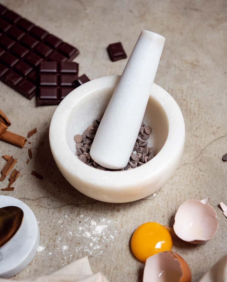 Con materiales nobles como el mármol con formas elementales y sólidas, textiles de cocina de fibras orgánicas y mucha intención.