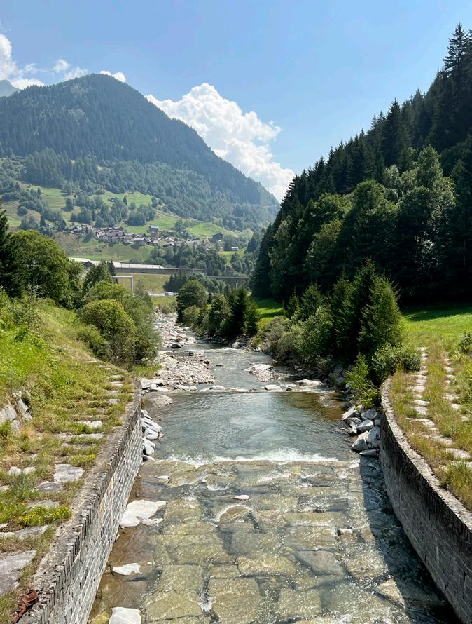 Continuiamo la nostra passeggiata, affrontando le difficoltĂ di unâabitante o di un turista nel passare dal villaggio al fiume. Un fiume che Ăš stato canalizzato negli anni Trenta, costruendo un bacino per lo stoccaggio di energia secondo una logica puramente funzionale. Ai tempi nessuno si chiedeva se le sponde potessero rimanere naturali, garantendo comunque lâaccesso al fiume agli abitanti.
