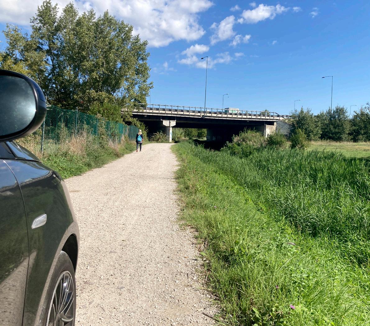 Mentre Martina parla, passiamo sotto a queste autostrade ingombranti e arriviamo al bacino artificiale, molto artificiale.