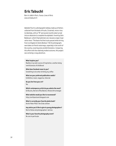 What inspires you? Reality is my main source of inspiration, another being reminiscences of childhood What does Facebook mean to you? Something to do when drinking my coffee What are your preferred publication media? Exhibition, book, magazine, Internet Do you live from your art? Yes Which contemporary artist do you admire the most? Ed Ruscha, Bernd & Hilla Becher, Richard Artschwager What website would you like to recommend? http://archipostcard.blogspot.com What is currently your favorite photo book? Archiv Peter Piller: Von Erde schöner Any advice you’d like to give to young photographers? Not to follow old photographers’ advices What is your favorite photography event? No one in particular