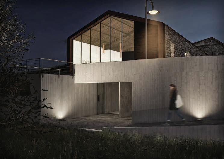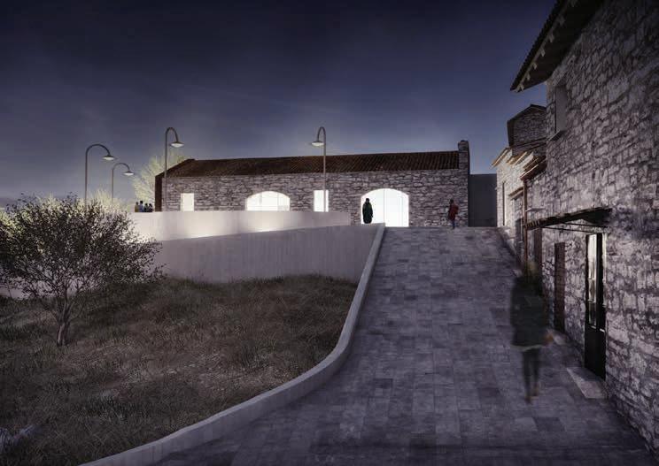 Sull’altro lato si trovano una sequenza di piccole case in pietra, che caratterizzano fortemente il luogo: qui il tempo sembra essersi fermato. Incorniciato da questi elementi, un vecchio frantoio, costituito solamente da un piano terra e da decadenti tetti a due falde, con struttura in legno. Il progetto si propone di preservare l’impatto storico dell’edificio, quindi, procedendo con una composizione per addizione, tutti i nuovi volumi sono interrati, ottenendo un nuovo piano. La pendenza del terreno interseca l’edificio, consentendo di definire un accesso diretto a entrambi i livelli.