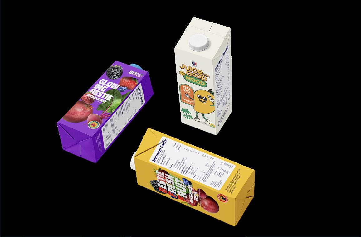 The white packaging was designed for Ultra Juice for kids, featuring fruit illustrations turned into playful characters to appeal to children.