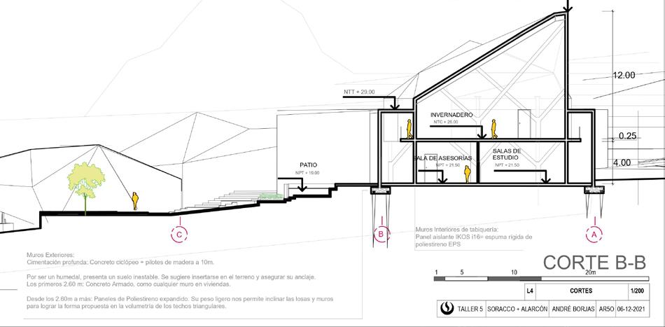 ELEVACIÓN SUR ELEVACIÓN NORTE ELEVACIÓN OESTE ELEVACIÓN ESTE Vigas de madera 0.15x0.15m Vigas de madera 0.15x0.29m Paneles de madera Techo de celosías de madera Techo, cubierta de paja, 31% Vigas de madera 0.15x0.15m Vigas de madera 0.15x0.29m Techo, cubierta de paja, 31% Vigas de madera 0.15x0.15m Pies derechos de madera 0.15x0.29m Techo de celosías de madera Vigas de madera 0.15x0.29m N+ 11.80m N+ 0.70 N+ 8.10m N+ 8.10m Techo, cubierta de paja, 31% Vigas de madera 0.15x0.15m Vigas de madera 0.15x0.29m Concreto pulido Concreto pulido Concreto pulido Pág.14 André Borjas Jaramillo