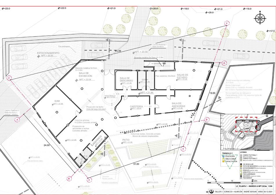 SALA EDUCATIVA 52m2 SH DEPÓSITO 13.5m2 SALA EDUCATIVA SH 8m2 SALA EDUCATIVA SALA EDUCATIVA 52m2 SH 8m2 CTO BOMBAS 15m2 LACTARIO ÁREA DE ESPERA DEPÓSITO SUM PRITE DEPÓSITO SUM CEBE SUM PRITE 123m2 SUM CEBE 120m2 TÓPICO COMÚN ARCHIVO PRITE ARCHIVO CEBE SALA DE REUNIONES 22m2 APAFA 13m2 SAANEE NPT +-0.00 PATIO INICIAL PATIO PRIMARIA NPT +-0.00 PATIO AULA VIVENCIAL 60m2 NPT +-0.00 ENTRADA ENTRADA ENTRADA A B B NPT -1.50 NPT +-0.00 SH 8m2 SH CTO CONTROL RESIDUOS ALMACÉN 9m2 CTO BOMBAS DPTO ED. FISICA MAESTRANZA GENERAL SH SH AULA PRIMARIA AULA PRIMARIA AULA PRIMARIA AULA INICIAL SH 30m2 AULA INICIAL 60m2 SALA PSICOPEDAGÓGICA DEPÓSITO Parapeto 0.60m Muro bajo + 0.90m Parapeto 0.40m Parapeto + 0.40m Proyección de puente A B C D E F G H K L M N O P Q R S A Parapeto + 0.10m FACULTAD DE ARQUITECTURA MONTERRICO CURSO: TALLER VI - ARQUITECTURA Y CONSTRUCCIÓN VS6H SECCIÓN: PROFESORES: PROYECTO: CEBE - PRITE (PUCALLPA) PLANO: PLANTA 1 (Nivel + 1.50m) ESC: 1/250 ARQ. TONY ANTEZANA PAUYAC ARQ. CARLOS FERNANDEZ SOTELO ALUMNO: LÁMINA A - 01 UPC UNIVERSIDAD PERUANA DE CIENCIAS APLICADAS SEDE: 1- BORJAS JARAMILLO, ANDRÉ ALONSO CÓDIGO: U201811822 FECHA: 11-07-2022 SH 17m2 vigueta de puente ESTACIONAMIENTO Muro celosía horizontal de madera DESCARGA C C Parapeto + 0.70m NPT +-0.00 LOSA DEPORTIVA Columna compuesta (doble madera 15x29cm) Proyección de Junta Piso de piedra Piso de piedra SH RAMPA DESCENDENTE 10% Muro de concreto T 1 2 3 4 6 7 8 9 10 12 13 14 11 1 2 3 4 6 7 8 9 10 12 13 14 11 A B C D E F G H K L M N O P Q R S V-1 1.50 1.20 0.90 V-2 1.50 0.30 1.80 V-3 1.50 1.20 0.90 V-4 1.30 1.20 0.90 P-1 1.00 2.50P-2 1.00 2.10P-3 1.00 2.10M-1 1.70 2.10M-2 2.40 2.10CUADRO DE VANOS VANO ANCHO ALTO ALFÉIZAR Taller VI Pág.13