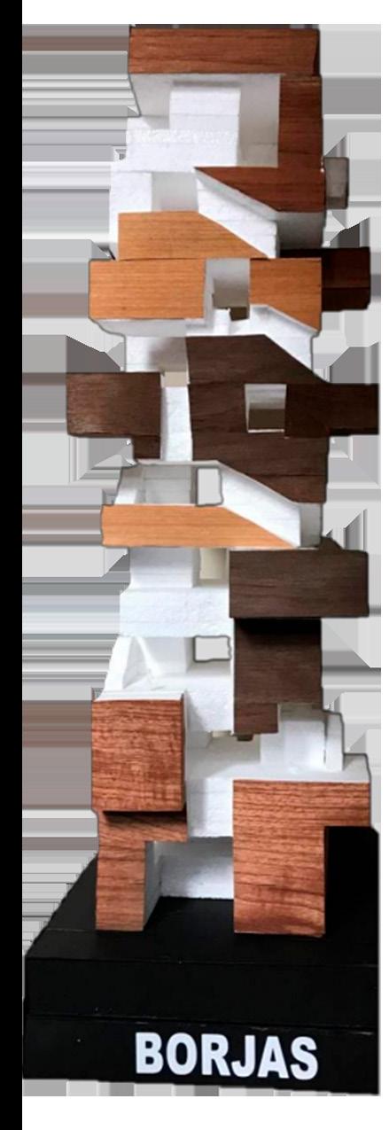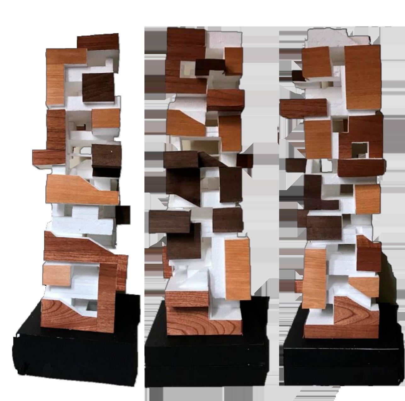 En este proyecto se ordenaron e intersectaron 21piezas de tecnopor, algunas tenían formas de cuadrados, rectangulos y “L”. Una vez se lograron los espacios, las piezas fueron forradas con enchapes de madera con 3 distintos tonos de marrón.