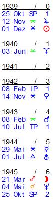 Marie-Louise von Franz *4.1.1915 • 2:25 Uhr • B • München (D). Eine Schweizer Altphilogin und Mitarbeiterin von C.G. Jung. 1933 traf sie C.G. Jung und in der Folge gab es kontinuierliche Kontakte und Diskussionen. Bei einer dieser Diskussionen beschrieb C.G. Jung eine Patientin, die seiner Meinung nach „auf dem Mond lebt“. In dem Moment begriff sie, dass es zwei Ebenen der Realität gibt, dass das psychologische Geschehen, die innere Welt mit ihren Träumen und Mythen, ebenso real sei wie die äussere Welt. Wie bei Emma und Toni spielt auch bei ihr der Mond eine herausragende Rolle in der Radix.